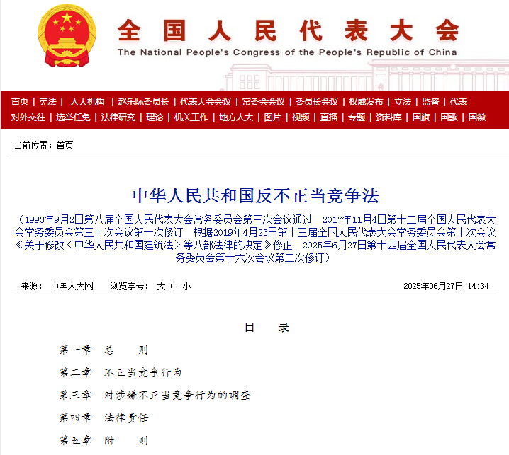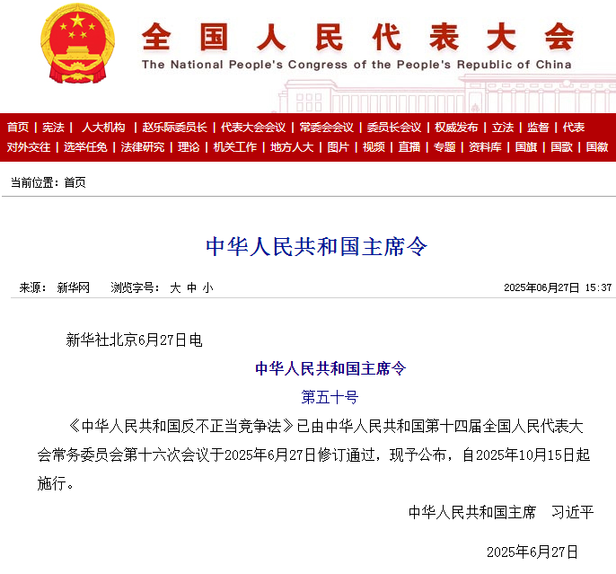 中华人民共和国主席令(第五十号)发布:《中华人民共和国反不正当竞争法》已由中华人民共和国第十四届全国人民代表大会常务委员会第十六次会议于2025年6月27日修订通过,现予公布,自2025年10月15日起施行。 新修订的反不正当竞争法包括总则、不正当竞争行为、对涉嫌不正当竞争行为的调查、法律责任、附则五章。这部法律规定,国家健全完善反不正当竞争规则制度,加强反不正当竞争执法司法,维护市场竞争秩序,健全统一、开放、竞争、有序的市场体系。 在商业贿赂方面,《反不正当竞争法》本次进行了若干修订: ·坚持“行贿受贿一起查”,在现行禁止实施贿赂规定的基础上,增加“单位和个人不得在交易活动中收受贿赂”。这一新增条款在原有受贿三类主体贿赂对象(交易相对方工作人员、受交易相对方委托办理相关事务的单位或者个人、利用职权或者影响力影响交易的单位或者个人)之外,明确将交易相对方也纳入贿赂主体。 ·将商业贿赂的罚金上限从300万元提升至500万元,新增对实施商业贿赂的经营者的法定代表人、主要负责人和直接责任人员的个人处罚(100万元以下),以及新增对个人收受贿赂的处罚(100万元以下) 此外,在完善不正当竞争行为相关规定方面: ·完善网络不正当竞争监管制度,明确经营者不得利用数据和算法、技术、平台规则等,实施恶意交易等不正当竞争行为(第13条); ·同时,还完善了虚假宣传(第9条)、不正当有奖销售(第11条)、商业诋毁(第12条)、滥用优势地位损害中小企业合法权益(第15条)等行为相关规定。 来源:中国人大网