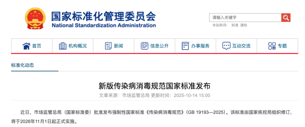 10月14日,市场监管总局(国家标准委)批准发布强制性国家标准《传染病消毒规范》(GB 19193—2025)。该标准由国家疾控局组织修订,将于2026年11月1日起正式实施。