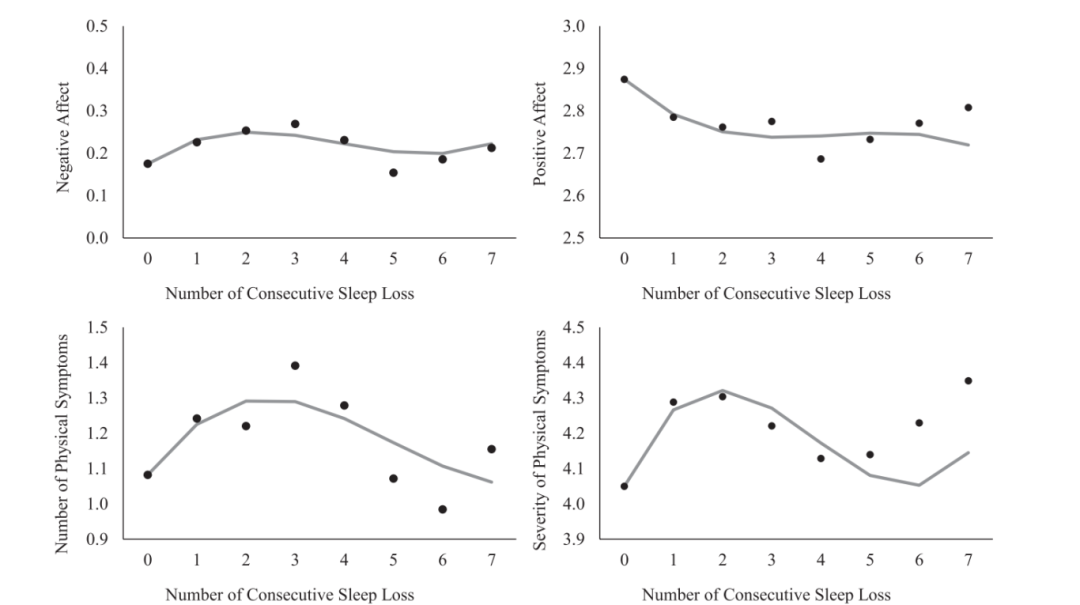 图2:通过连续睡眠丧失预测日常情感和身体健康的轨迹,灰线代表基于线性、二次方和三次方效应的幸福感估计轨迹。图片来源自[2]