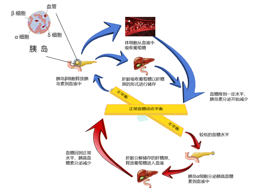 1869年,德国病理学家保罗·朗格尔汉斯在显微镜下观察胰腺的结构时,发现其中分布着一团团大小不等的细胞群,如同大海上漂浮的岛屿,当时这些细胞团被命名为朗格尔汉斯胰岛,后来被称为“胰岛”。人体胰腺中有100万-200万个胰岛,但其总体积占整个胰腺的1%-2%,重量仅1-2克。每个胰岛都是独立、精巧的微器官,由形态、功能各异的内分泌细胞构成,包括α细胞、β细胞、δ细胞、PP细胞,数量分别占胰岛细胞的24-40%、60-80%、6-15%、1%。其中,α细胞分泌胰高血糖素、β细胞分泌胰岛素,这两种激素的分泌对调节人体血糖发挥着至关重要的作用。 要说清这个问题,首先需要了解一下“血糖”是什么?食物经过一系列复杂的消化分解后转化为葡萄糖,由胃肠道吸收进入血液。血液中的葡萄糖含量,即为血糖。葡萄糖是细胞能量的主要来源,我们的一举一动都需要“燃烧”葡萄糖来提供能量,但是这个“燃烧”过程,只有在葡萄糖进入细胞后才会启动,因此细胞获取葡萄糖的能力影响着血糖的高低。 正常情况下,餐后随着食物的消化吸收血糖升高,胰岛中的β细胞便会分泌胰岛素,刺激细胞对葡萄糖的摄取和利用,如果多余的葡萄糖用不完,还会促进其转移到肝脏,以糖原的形式储存备用。总之,经过胰岛素的作用后,人体中血糖含量下降,回到正常水平。相反,在饥饿或剧烈运动消耗血糖时,人体血糖含量下降,胰岛中的α细胞会分泌胰高血糖素,将肝脏中储存的糖原分解成葡萄糖,进入血液,防止血糖过低。健康人的胰岛细胞通过分泌这些激素把血糖水平调控在正常的范围内,维持机体健康,如下图所示。 当胰岛素分泌不足或不能被细胞有效利用时,多余的葡萄糖就无法进入细胞,在血液中积聚起来。体内血糖高到一定水平时,肾脏也无法把血液中葡萄糖全部“回收”,一部分葡萄糖就会随尿液排出,形成“糖尿”,这是“糖尿病”的典型临床症状。 糖尿病是一种常见的慢性病,是由遗传、生活习惯等因素共同作用而引起,主要分为1型和2型糖尿病。1型糖尿病是指胰岛β细胞破坏,基本无法分泌胰岛素,需终身依赖胰岛素治疗。2型糖尿病是指胰岛可以产生胰岛素,但无法分泌足够的量,或者胰岛素刺激细胞获取葡萄糖的能力下降,导致血液中葡萄糖含量高于正常水平。糖尿病患者若长期不注意控制血糖,可能引起全身小血管病变,形成多种并发症,如糖尿病足溃疡、视网膜病变、肾病、高血压等。