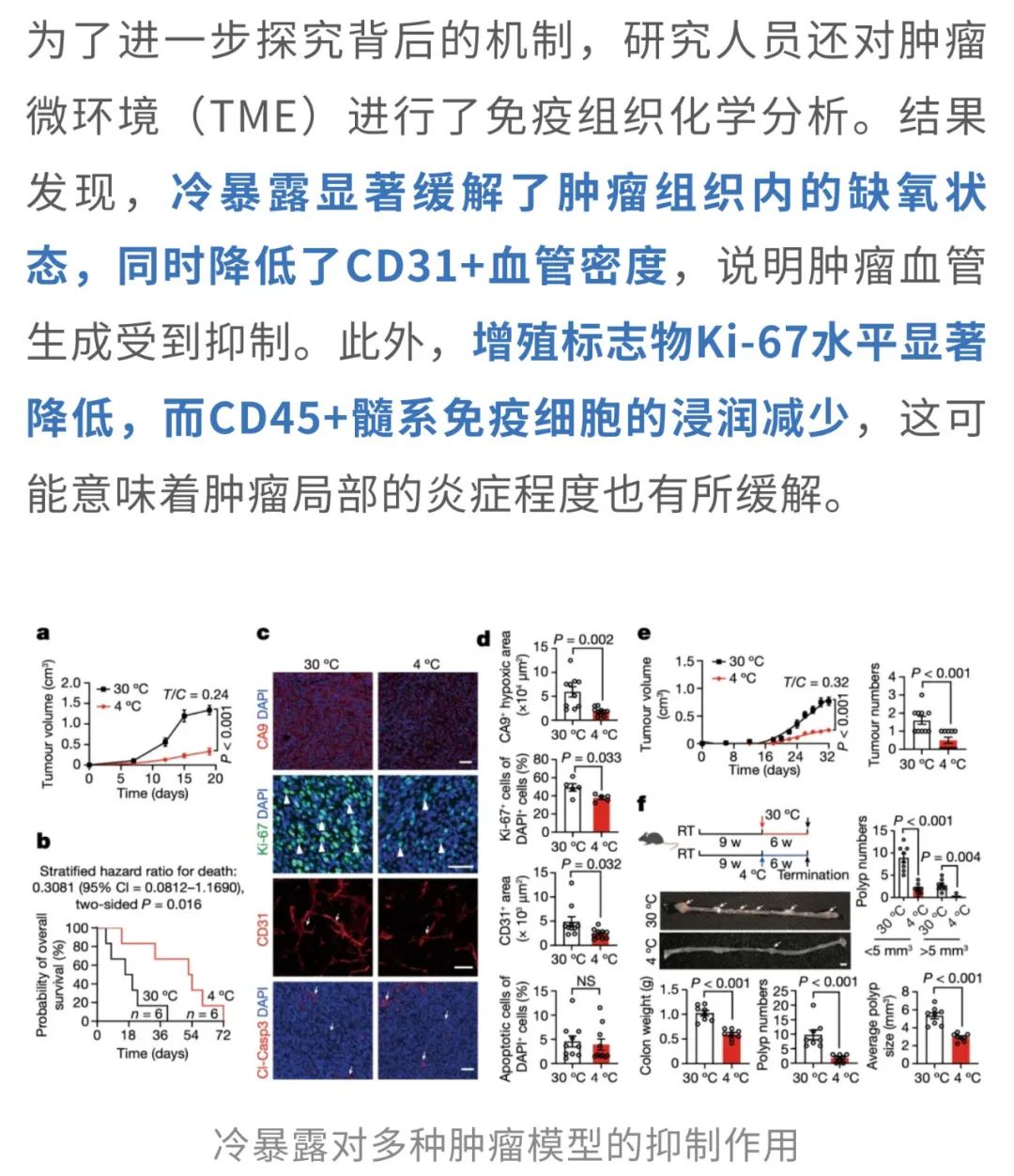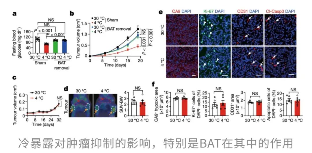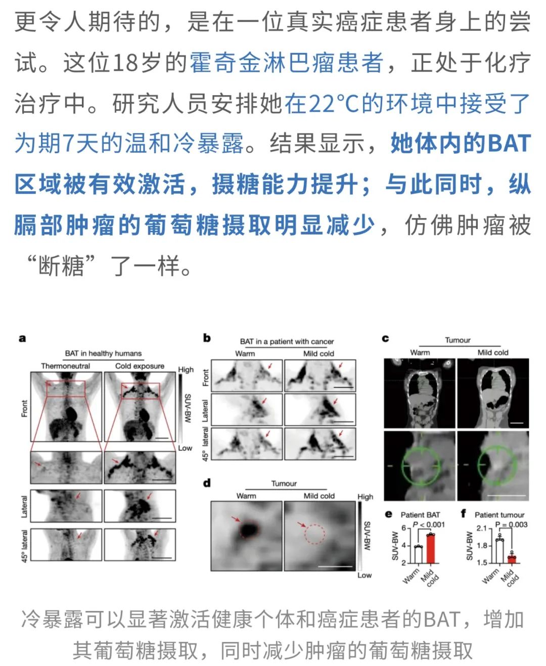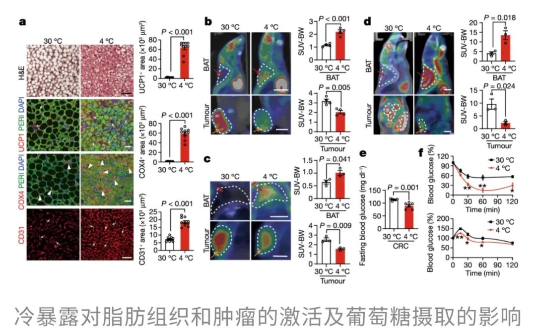 夏天的命,一半靠冰西瓜续着,一半靠空调吊着。前者是天然清甜的慰藉,后者是人类智慧的结晶——在三十几度的高温里,一口冰西瓜能让人从口腔凉到心底,而一阵冷气吹来,仿佛全身的火气、闷气、坏脾气都被一键清空。在这样的酷暑中,空调不仅让人“活下来”,更像是身体和情绪的“降温阀门”。 但冷空调这股凉意带来的,可能不只是主观上的清爽——来自瑞典卡罗林斯卡学院的华人科学家曹义海教授团队发表于Nature的一项研究[1]发现:低温环境还能激活我们体内的“自带燃脂引擎”——棕色脂肪组织(BAT),让它主动燃烧能量、产热,并吞噬血液中的葡萄糖。而且,这一行为竟然会和癌细胞“抢糖”!结果就是:肿瘤细胞“抢不到糖”,能源告急,生长受限。在患癌小鼠中,冷环境显著延缓了肿瘤进展,延长了生存时间;在人类试验中,仅仅将环境温度调低到22℃,也观察到了同样积极的抑癌信号。 冻一冻, 癌细胞就“蹦跶”不起来了? 提起癌症,许多人首先想到的是“基因突变”或“细胞无限增殖”。但其实,从代谢的角度来看,癌症同样是一种严重的能量调控紊乱。尤其是实体瘤,它们在生长过程中对葡萄糖的依赖极强——即使在氧气充足的环境中,也依旧选择低效但快速的“糖酵解”来供能,这种现象被称为Warburg效应。 那么,既然癌细胞“嗜糖如命”,如果能从体内的糖供应端“截胡”,是否就能从源头遏制它们的生长?带着这个思路,研究人员把目光投向了一个能“吞糖”的天然组织——BAT。在低温环境下,BAT被激活,启动以线粒体解偶联蛋白1(UCP1)为代表的非颤抖产热机制,快速消耗葡萄糖用于保温产热。也就是说,BAT一旦被“唤醒”,就会变身为体内“抢糖能手”。 这意味着,癌细胞几乎被“锁”在静止阶段,失去了活跃分裂的能力,就像进入了“待机模式”。 值得一提的是,这种现象并非只在CRC模型中出现。在纤维肉瘤、乳腺癌、黑色素瘤、胰腺癌等多种肿瘤模型中,低温暴露同样表现出显著的抑癌效果。 那么,这些组织的“高能耗”是否真的会影响肿瘤赖以生存的葡萄糖供应? 这说明冷暴露下BAT“截胡”了葡萄糖资源,导致肿瘤“无糖可用”。 BAT或UCP1“罢工”, 冷抑癌体系也跟着“崩”了 此前的研究已经表明,冷暴露能够激活BAT,显著提升身体的产热代谢水平。但问题是,这种代谢上的变化,是否真的能够转化为对肿瘤生长的有效抑制?为此,研究人员展开了进一步验证。 实验显示,在低温环境下,小鼠的整体代谢率明显提高。 换句话说,低温让机体“抢糖”的能力增强了,而对于依赖高糖代谢生长的肿瘤细胞来说,这无疑是一次釜底抽薪。 那么这些被“抢走”的葡萄糖究竟去了哪里?是否都被BAT“抢”走了?为了验证这一点,研究人员将小鼠体内的BAT切除,看看没有BAT的情况下,冷暴露是否还能继续“冻住”肿瘤。 结果十分直观:一旦BAT被切除,小鼠在4°C环境下的血糖水平迅速回升,说明BAT的确是冷暴露下最主要的“吃糖大户”。更关键的是,那些原本在低温中被显著抑制的肿瘤,此时也像是被“解冻”了一样重新开始增长,冷暴露的抗肿瘤效果随之消失。而对照组中,在30°C环境下切除BAT,对肿瘤生长并没有明显影响。这一对比结果进一步强调了:冷暴露下BAT的活化,是其实现抑癌效应的关键。 当然,BAT之所以能够产热、吞糖,离不开其中一个核心角色——UCP1。它是非颤抖产热的“启动器”,能将线粒体产生的能量直接转化为热量,而不是用来合成ATP。那么如果这个“能量熔炉”的开关坏掉了呢?冷暴露的抑癌效应还是否成立? 这说明,UCP1是连接低温、BAT产热与抑癌效应之间的关键纽带。一旦缺失,哪怕身处冰冷环境,BAT也无法吞糖产热,肿瘤就会重新获得生长所需的“燃料”,冷暴露抑癌的效应也就随之崩塌。 “温柔版冻癌术”, 或许也可行 最后,大家最关心的问题来了:这样“冻肿瘤”的方法,真的能用在人身上吗? 虽然每个人BAT激活的程度略有差异,但至少说明一点:只要温度够低,即便是成年人的BAT也能“点火启动”,而且16℃也许就能达到效果(比起小鼠实验用到的4℃,已经人性化太多了)。 总的来说,这项研究提示,低温暴露并非简单的“物理降温”,而是通过激活BAT、重塑葡萄糖代谢格局,从而系统性地干预肿瘤的代谢需求和TME构成,最终实现广谱性的抑癌效果。即便是在一个多数人都能轻松忍受的温度(比如22℃),我们体内的BAT依然有可能被激活,开始大量“吞糖”,从而和肿瘤争夺营养,切断它的能量供给。这种思路下的“低温疗法”,为癌症治疗提供了一个前所未有的方向。 “冻一冻”不只是发抖, 还能改善代谢和心血管健康 不过,寒冷的“魔法”可不仅仅是让癌细胞抢不到糖、被活活“饿死”这么简单。研究人员将目光转向了更广泛的层面:寒冷是否还能对我们整体的代谢和心血管健康产生影响? 来自荷兰马斯特里赫特大学的研究团队发表在Nature Metabolism的一项研究[2],给出了令人振奋的答案。研究发现,这种看似“冻一冻”的干预方式,不仅能改善口服葡萄糖耐量(OGTT)和空腹血糖水平,还能显著降低甘油三酯(TG)和游离脂肪酸(NEFA)浓度,连收缩压和舒张压也同步下降,展现出寒冷对多重代谢指标和心血管健康的积极调节作用。 其实,这一发现并非空穴来风。此前就有研究指出,寒冷适应有助于提升2型糖尿病患者的胰岛素敏感性。不过,随后的研究却发