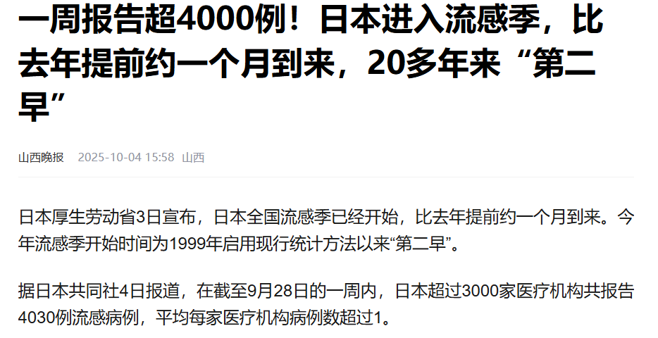 此地流感大暴发,“疫情很可能扩散至周边国家”! 据中国新闻网报道,据《自然》报道,鉴于已有几千人感染流感病毒,日本卫生部门日前宣布全国进入流感大流行期。研究人员称,今年感染流感病毒的规模非同寻常,并可能在即将入冬的亚洲和欧洲国家引发疫情。 截至10月10日,日本已报告6013例流感病毒感染病例,100多所学校已关闭。9月因流感住院的287人中,近一半是14岁及以下的儿童。日本厚生劳动省10月3日宣布日本全国进入流感大流行期。当特定区域在特定时段内的感染人数超过预期时,疫情就被认定为流行。 流感病毒通常每年呈季节性暴发,在温带国家主要集中于冬季。在日本,流感高峰期通常出现在11月下旬。澳大利亚莫纳什大学马来西亚校区的分子病毒学家Vinod Balasubramaniam指出,今年流感患者就诊人数的增长比往年提前了5周。 世界卫生组织流感参比和研究合作中心副主任Ian Barr表示,日本过去几年流感季都来得较早,但没有像今年这么早。“10月可能出现一些病例,但不会达到流行病规模。”他说。 日本国立健康危机管理研究机构新发布的数据显示,9月29日至10月5日这一周,日本全国报告的流感病例数是上一周的1.5倍。受海外旅行活跃、防范意识下降、气候变化等多重因素影响,日本流感流行季比往年提前约一个月。 Balasubramaniam指出,新冠疫情后国际旅行增加可能是导致流感季提前到来的原因之一。其他因素还包括气候变化,以及人群缺乏接触流行病毒的机会,特别是老年人和幼儿。 日本境内流行的病毒株的信息尚未公布,但Barr指出,疫情可能由一种名为H3N2的甲型流感毒株引发。过去两个月,这种病毒数量在澳大利亚和新西兰激增。他表示,大量澳大利亚人前往日本,意味着病毒在南北半球间传播的风险显著增加。 Balasubramaniam说,包括马来西亚在内的其他国家今年也出现了流感季提前的情况,其中H3N2毒株占主导地位。据报道,马来西亚约有6000名学生被感染,部分学校已停课。Barr说,澳大利亚和新西兰也曾出现流感病例提前激增,且疫情中出现了不止一种病毒毒株。 Barr指出,鉴于南半球国家正进入温暖季节,病毒传播将减弱,日本当前的流感疫情不太可能演变为全球大流行。“但疫情很可能从日本扩散至周边国家,或从日本出发的旅行路线上的沿途国家。”Barr表示,即将进入冬季的国家更易暴发疫情。