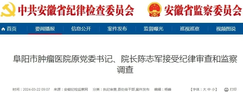 阜阳市肿瘤医院原党委书记、院长陈志军接受纪律审查和监察调查