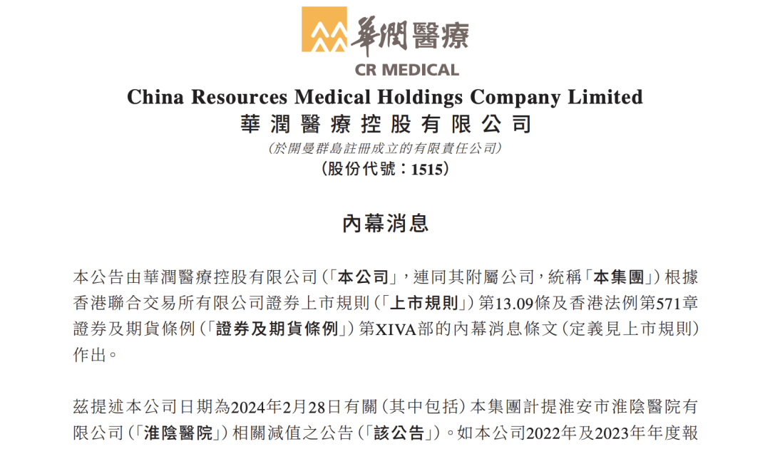 5 月 10 日,华润医疗公告称,由于旗下淮阴医院经营情况持续下滑,陷入亏损,公司拟向监管部门申请停止经营,获批后将正式关停该医院业务。