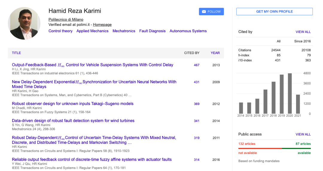 1998年,在伊朗德黑兰谢里夫理工大学获得电力系统理学士(第一荣誉)学位,2001年和2005年,分别在德黑兰大学获得控制系统工程硕士和博士(第一荣誉)学位。自2016年以来,他一直是意大利米兰理工大学机械工程系的应用机械学副教授。他的研究兴趣包括控制系统和机电一体化,并应用于汽车控制系统和风能。Karimi教授目前担任Journal of Cyber-Physical Systems,Journal of Machines, International Journal of Aerospace System Science and Engineering, Journal of Designs 等四个期刊的主编;Journal of Electronics和Journal of Science Progress两个期刊的区域主编, The Franklin Institute期刊的高级编辑,以及包括IEEE Transactions on Neural Networks and Learning Systems,IEEE Transactions on Circuits and Systems-I: Regular Papers, IEEE/ASME Transactions on Mechatronics, IEEE Transactions on Systems, Man and Cybernetics: Systems, Information Sciences, IFAC-Mechatronics, International Journal of Robust and Nonlinear Control 等多个国际期刊的副编辑。此外,Karimi教授还担任IEEE 系统与不确定技术专委会,工业信息物理系统专委会,IFAC 机械与电子系统专委会,鲁棒控制专委会成员,自动控制专委会成员。基于他的杰出成就和贡献,Karimi获得多个奖项:Alexander-von-Humboldt研究奖学金奖、JSPS研究奖、DAAD研究奖、August-Wilhelm-Scheer奖。Karimi教授发表500余篇论文和报告,H因子70,为Web of Science数据库2016-2019年度ESI(Essential Science Indicators)高被引学者。Karimi教授在 Google Scholar 上的论文总引用数近 25000:
