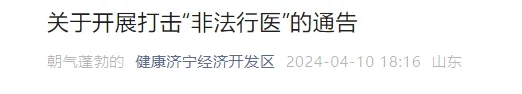 就在4月10日,山东济宁市卫生健康委员会经开区管理办公室发布了《关于开展打击“非法行医”的通告》。