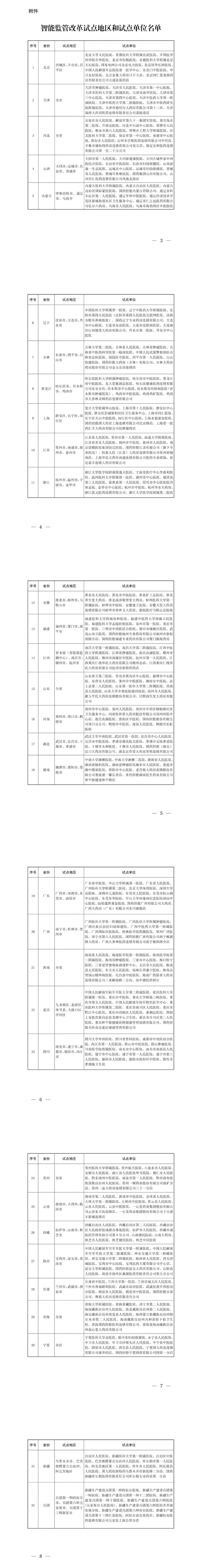 7月23日,国家医保局发布《关于公布智能监管改革试点地区和试点单位的通知》,确定试点地区92个(其中天津、河北、山东、海南、贵州、青海、宁夏为全省域范围内试点)、试点定点医药机构359家(名单见文末)。