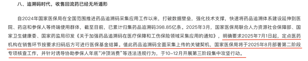 国家医保局局长章轲近期在调研中指出,药品追溯码采集和应用是今年医保基金管理突出问题专项整治的重点任务,7月1日起全国定点医药机构在销售医保药品时,必须全流程记录药品的购进、使用、库存以及追溯码等信息,执行“应采尽采、依码结算、依码支付”。