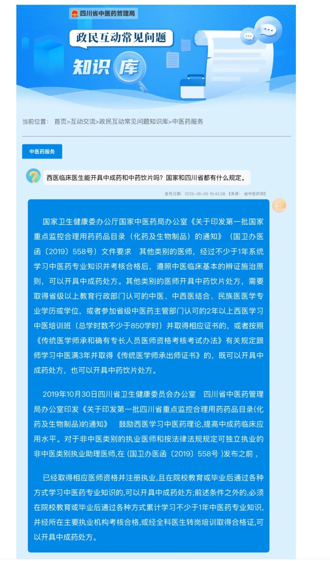 例如今年5月5日,面对开始严管的中成药处方权问题,四川多名医生就在四川省中医药管理局官方平台上咨询:西医临床医生能开具中成药和中药饮片吗?国家和四川省都有什么规定?