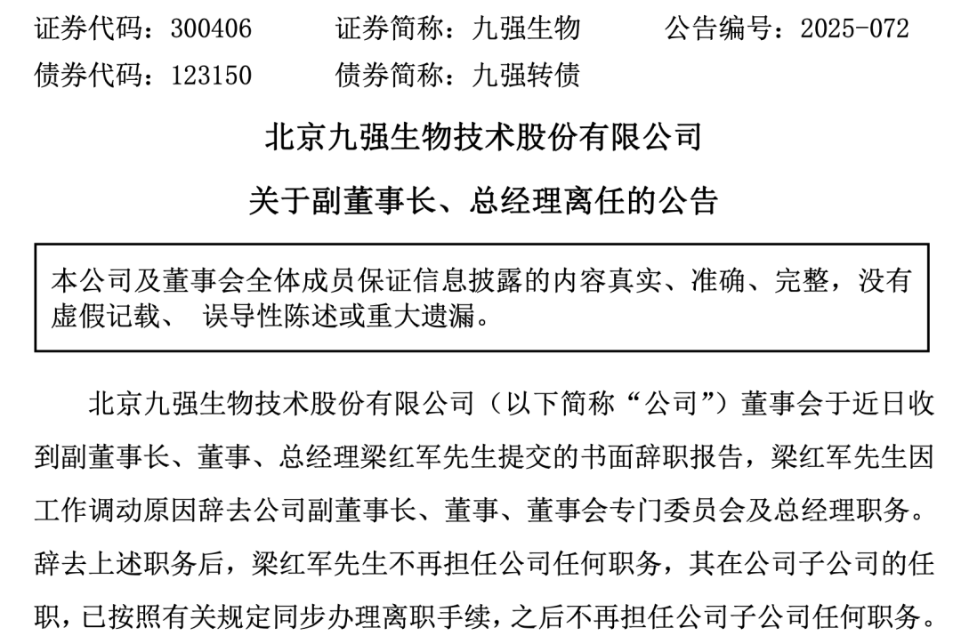 九强生物表示,辞去上述职务后,梁红军不再担任公司任何职务,其在公司子公司的任职,已按照有关规定同步办理离职手续,之后不再担任公司子公司任何职务。
