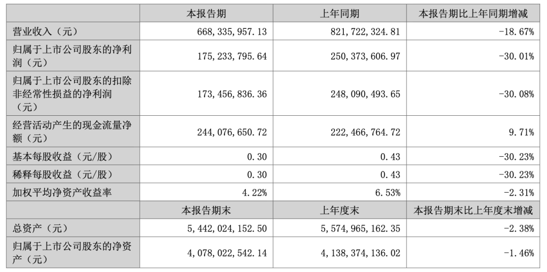 业绩方面,2025年上半年,公司实现营业总收入6.68亿元,同比下降18.67%;归母净利润1.75亿元,同比下降30.01%;扣非净利润1.73亿元,同比下降30.08%。公司2025年半年度分配预案为:拟向全体股东每10股派现3元(含税)。