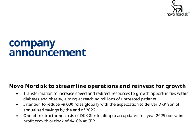 此次转型反映了诺和诺德在全球需求持续上升的背景下,尤其在竞争日益激烈、消费者导向日益明显的肥胖症市场中,保持竞争力的决心。近年来,诺和诺德的快速扩张带来了组织复杂性和成本的上升。此次转型旨在解决这一问题,使诺和诺德能够加大对科研、商业能力和产能扩张的投资,从而惠及更多尚未接受治疗的患者。诺和诺德全球总裁兼首席执行官Mike Doustdar表示:“作为全球肥胖症和糖尿病领域的领导者,诺和诺德为全球患者带来改变生命的产品。但我们的市场正在发生变化,尤其是在肥胖症领域,竞争加剧且更加以消费者为导向。我们的公司也必须随之进化。这意味着要建立更强的绩效文化,更有效地配置资源,并优先投资于最具影响力的领域——即我们的核心治疗领域。”此次裁员将覆盖公司各个部门,包括后勤支持和总部职能,预计到2026年底将带来约80亿丹麦克朗的年化成本节约。这些节约将被重新投入到糖尿病和肥胖症领域的增长机会中,包括商业执行举措和研发项目。转型将立即启动,诺和诺德将在未来几个月内与受影响的员工沟通,具体安排将依据各国劳动法规进行协商。此外,公司还将实施更多举措,以增强组织专注力、绩效文化和决策效率,同时提升成本效益。Mike Doustdar补充道:“看到才华横溢、备受尊敬的同事离开总是令人难过,但我们坚信,这是确保诺和诺德长期成功的正确之举。我们需要在思维和行动上做出转变,以变得更快速、更敏捷。我们的转型计划正是为了实现这一目标。通过重新配置资源,我们将能够优先投资于可持续增长和未来创新,造福全球数百万糖尿病和肥胖症等慢性病患者。”此次全公司转型预计将产生约80亿丹麦克朗的一次性重组成本(包括资产减值)。其中,约90亿丹麦克朗的重组成本将在2025年第三季度计入,而第四季度将节约约10亿丹麦克朗。因此,诺和诺德预计2025年全年营业利润增长(按固定汇率计算)将因此下调约6个百分点。2025 年预期的这一变化仅考虑了上述一次性重组成本。2025年前六个月财务报告(公司公告第20/2025号)第26页中的“前瞻性声明”同样适用于本公告。诺和诺德将于2025年11月5日发布2025年前九个月财务业绩及全年财务展望。