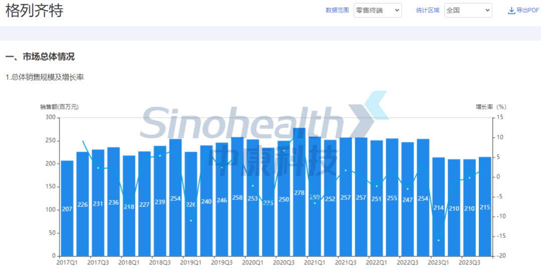 而原研品牌达美康在零售渠道也经受住了“考验”,销售规模十分稳定,其在格列齐特缓释片市场占比一直超50%,直到2023年由于国内口服降糖市场竞争加剧,其零售市场规模才出现下滑趋势。