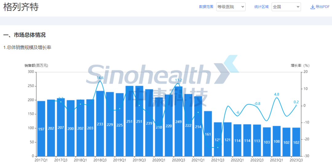格列齐特全国等级医院销售情况(截至2023年3季度)
