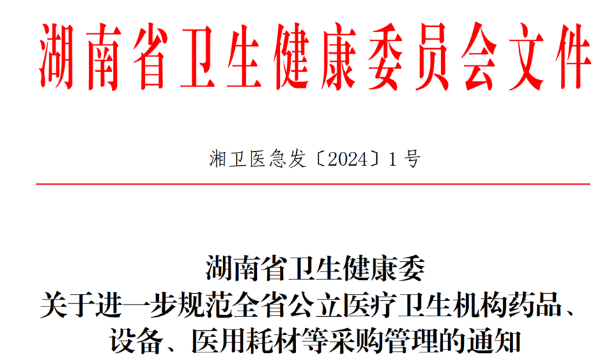 近日,湖南卫健委下发《关于进一步规范全省公立医疗卫生机构药品、设备、医用耗材等采购管理的通知》,公立医院药品、耗材和设备采购将迎来一些新变化。文件将于5月3日起正式执行。