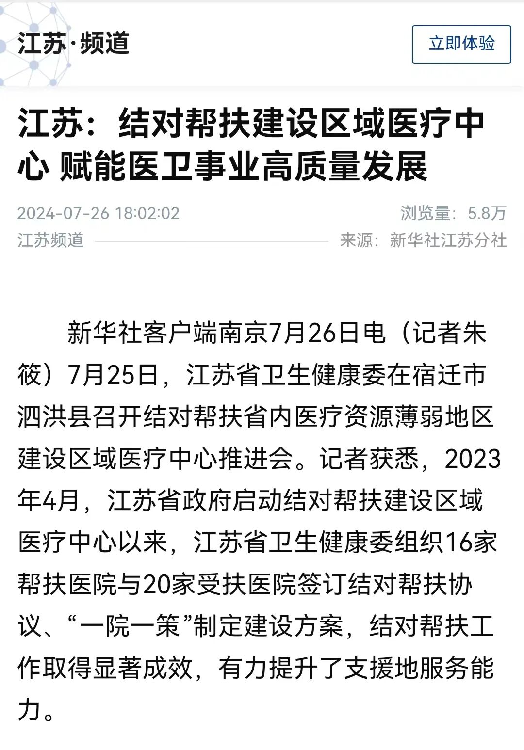7月25日,江苏省卫生健康委在宿迁市泗洪县召开结对帮扶省内医疗资源薄弱地区建设区域医疗中心推进会。2023年4月,江苏省政府启动结对帮扶建设区域医疗中心以来,江苏省卫生健康委组织16家帮扶医院与20家受扶医院签订结对帮扶协议、“一院一策”结对医院制定建设方案,结对帮扶工作取得显著成效,有力提升了支援地服务能力,获人民日报、新华社等媒体关注。