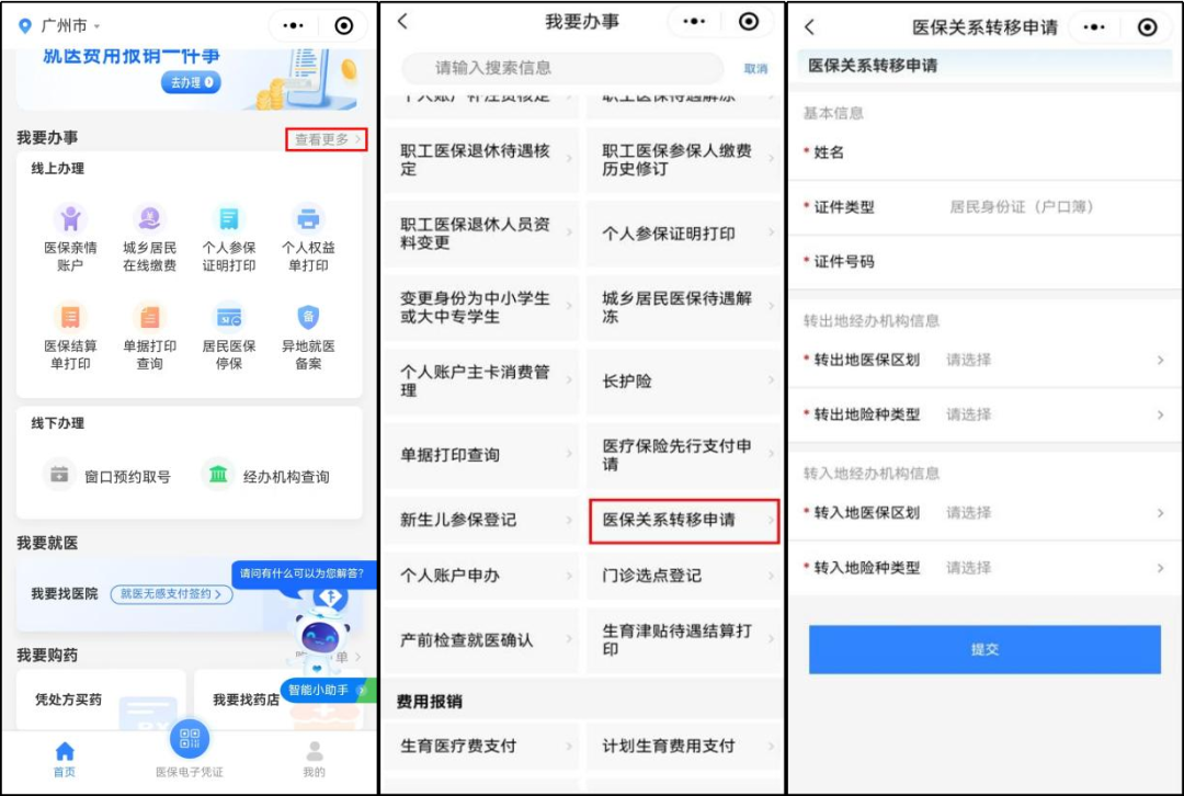 微信搜索进入“粤医保”小程序,点击首页我要办事模块“查看更多”,选择“医保关系转移申请”,即可进入转移接续业务申请页面。