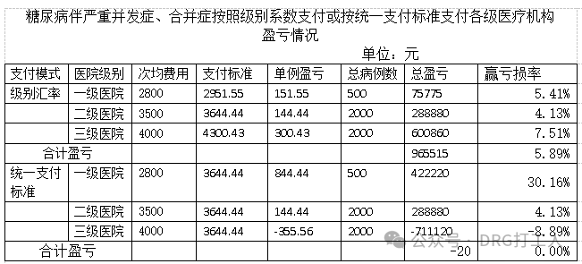 在不考虑权重谈判、不考虑病源变化的基础上,糖尿病不伴并发症合并症的平均费用为2241.93元,该地区全体病例的平均费用为7000元,该病种的权重为0.3203。糖尿病伴严重并发症、合并症的平均费用为3644.44元,该地区全体病例的平均费用为7000元,该病种的权重为0.5206。在实行统一支付标准支付或按级别系数支付,各级医院的营收对比。