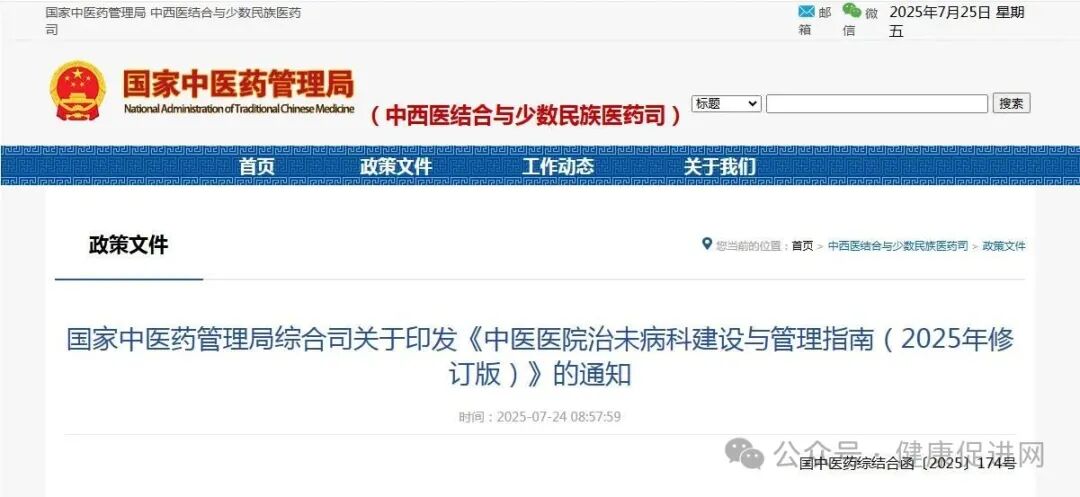 国家中医药管理局综合司关于印发《中医医院治未病科建设与管理指南(2025年修订版)》的通知