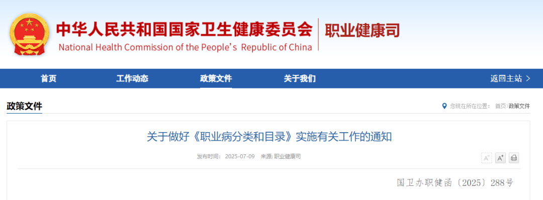 2024年12月,国家卫生健康委与人力资源社会保障部、国家疾控局、全国总工会等4部门联合印发新版《职业病分类和目录》,将于2025年8月1日起正式实施。为指导地方有序做好实施工作,国家卫生健康委办公厅、国家疾控局综合司联合印发《关于做好〈职业病分类和目录〉实施有关工作的通知》(以下简称《通知》)。