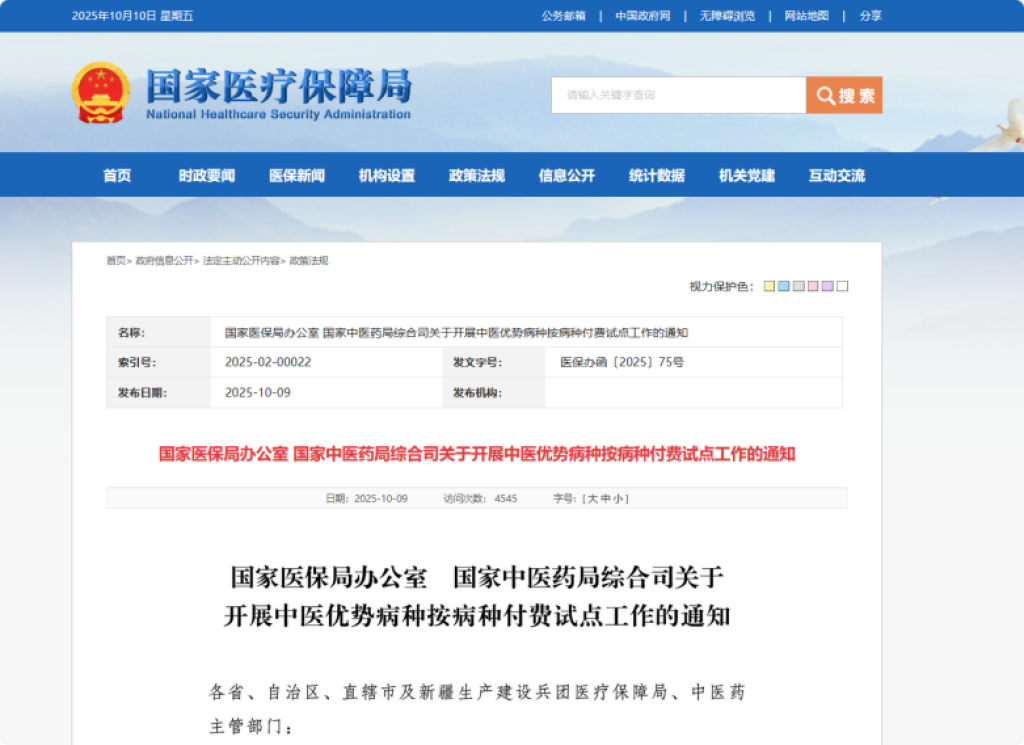 10月9日,据国家医保局官网消息,国家医保局、国家中医药管理局联合发布《关于开展中医优势病种按病种付费试点工作的通知》,将遴选15个左右省份或地级市开展试点工作,用2~3年时间先行先试,积累一批中医药医保支付方式改革经验,并逐步向全国推广。