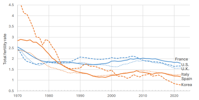 第二组国家包括日本、韩国、希腊、意大利、葡萄牙和西班牙,它们的共同点是,都在20世纪50至60年代经济快速起飞。1970年代,这些国家的每位妇女一生仍然生育三个孩子以上,但进入1980年代中期后,这一数字迅速跌破更替水平,大多降至两个以下。到了1990年代中期,多数国家的总和生育率已逼近1.3。