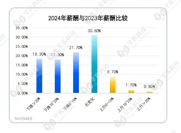 华医网《医疗人才 2024 年薪资及就业调研报告》(覆盖全国 29 个省份的 29469 名医务人员)用数据印证了降薪的普遍性:2024 年有 57.9% 的受访者薪酬下降,较 2023 年的 37% 上升 20 个百分点,相当于每 2 名医务人员中就有 1 人收入缩水。