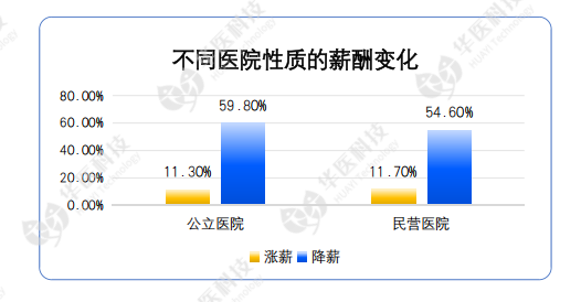 从结构上看,降薪呈现明显的 「分层特征」:二三级医院降薪人员占比达 63.2%,显著高于一级医院的 41.5%,这与大医院绩效工资占比更高直接相关;公立医院降薪比例(61.8%)远超民营医院(38.7%),因公立医院受政策调控和医保支付影响更直接。