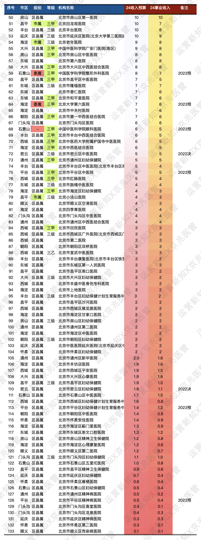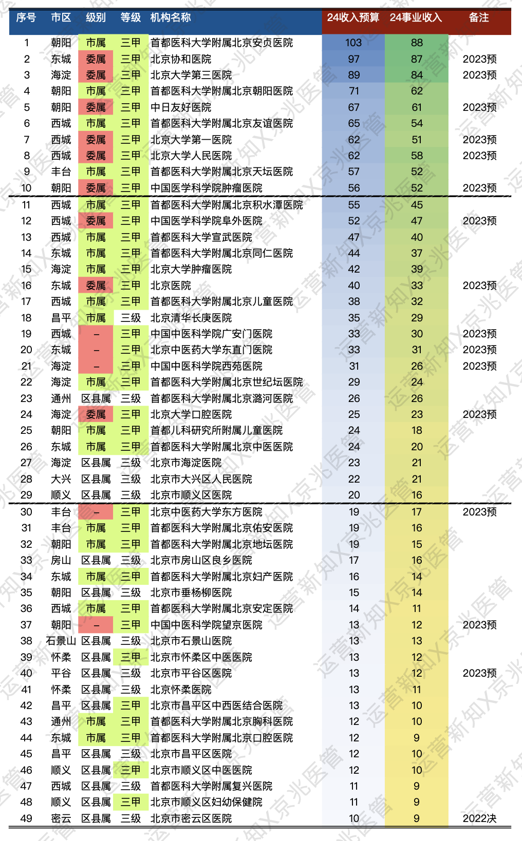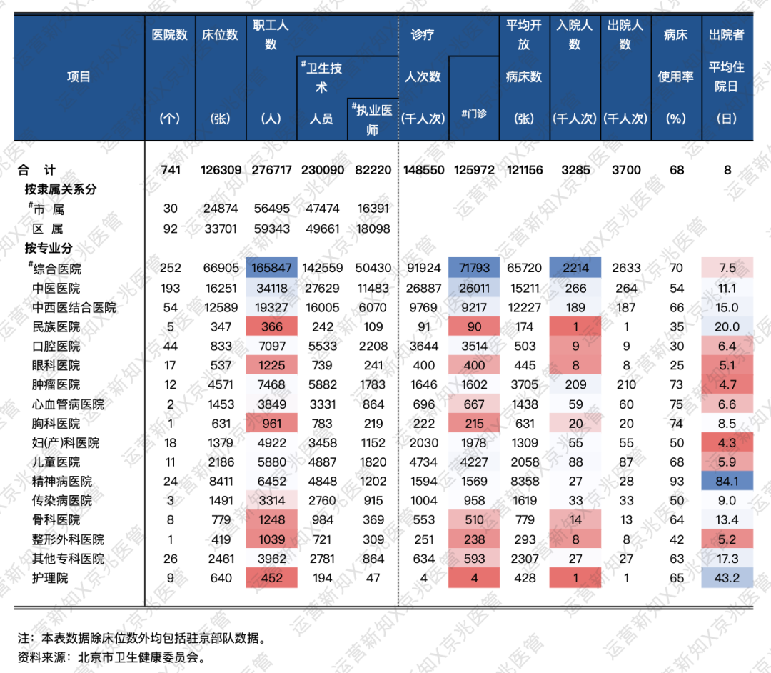 2024年医院运营观察正式开启。 北京作为我国医院医疗技术兜底的存在,各大医院持续多年登顶各大医院排行榜。 笔者在北京生活10年,一些头部医院也实地参观过,实际感受为“能力越大、责任越大”。 北京,简称“京”,是中华人民共和国的首都,是全国的政治中心、文化中心,是世界著名古都和现代化国际城市。 户籍居民期望寿命82.5岁,全国第2 城镇人口比重87.5%,全国第2 卫生总费用3351.9亿元 人均卫生总费用1.4万元(2020),全国第1 居民年均就诊10.4次,全国第2 居民年住院率16.8%,低于全国0.7百分点 医院 每百门急诊入院2.7人次,全国最低 门诊次均680元,住院次均2.6万元,均为全国最高 总住院手术率49%,比全国高9百分点,全国第4 平均住院日8.6天,比全国低0.4天 医疗机构 每百门急诊入院1.7人次,全国最低 人均总收入84万元,全国第2 人均财政拨款13万元,全国第4 人均事业收入64万元,全国第2 人均总支出79万元,全国第2 人均结余4.5万元,全国第3 人员经费支出占比为33.1%,比全国平均低3.6百分点,全国第4低 人均人员经费26.2万元,全国第2 注:数据来自中国卫生健康统计年鉴2022 常住人口2184.3万人,较上年度下降4.3万人 其中外来常住人口占38%,60岁及以上人口占21%,65岁及以上占15% 医疗卫生机构12211家,其中三级医疗机构138家 卫生人员39.5万人,医师12.5万人,管理人员2万人 编制床位14.5万张,其中医院13.3万张,实有床位13.4万张 医疗机构共诊疗23102.4万人次,出院379.5万人次 实有床位使用率65.9%,平均住院日8.1天 全市二级以上公立医院门诊患者次均医药费701.9元,其中药费305.2元 住院患者人均医药费用25372.6元,其中药费5114.0元 全市医疗卫生机构总费用2997.4亿元,比上年增长4.7% 其中财政拨款551.4亿元,比上年增长16.0% 注:数据来自北京卫健委、北京统计年鉴2023 全年实现地区生产总值43760.7亿元,比上年增长5.2% GDP排全国第13 注:以上数据来自北京市统计局。 图 北京国贸 医疗卫生资源状况。“十三五”以来,首都卫生资源总量持续增长,但距国内和国际大城市仍有差距,与人民群众的期盼和首善标准相比还有不足。2020年全市共有医疗卫生机构11211家,实有床位12.7万张,分别较2016年增长5.4%、8.7%。按照机构类别划分,医院733家(公立227家、民营506家),基层医疗卫生机构10183家,专业公共卫生机构111家,其他机构184家。每千常住人口编制和实有床位数分别为6.27张和5.81张,低于全国6.3张的平均水平,也低于上海6.4张、重庆7.4张等国内大城市每千人床位数量,与东京(9.6张)、巴黎(12张)等国际城市差距明显。但核心区每千人实有床位数较高,为13.9张,明显高于外围地区,资源分布不均衡问题仍然凸显。 全市共有三级医院104家(不含驻京部队医院),其中国家卫生健康委属管医院17家、市属医院22家、区属28家、其他部门企业及社会办医37家。全市卫生人员数37.6万人,较2016年增长13.6%。其中执业(助理)医师11.9万人,注册护士13.5万人,每千常住人口执业(助理)医师5.41人、注册护士6.15人。 优质医疗卫生资源主要集中在中心城区,区域分布不均衡。全市三甲医院中超过80%布局在中心城区。大兴、顺义等平原多点地区和密云等生态涵养区优质医疗卫生资源相对不足。 基层卫生服务体系相对薄弱,分级诊疗制度尚未落实到位。分级诊疗在国家层面刚刚起步,尚未充分显现效果。一方面,大医院优质资源聚集促进了学科高度分化发展,医疗水平不断提升,对患者及高水平医学人才“虹吸”作用凸显。部分三甲医院长期处于超负荷运转状态。另一方面,基层医疗卫生机构基础设施相对薄弱、人才队伍和技术能力水平参差不齐,对居民就医吸引力有待提升,尚不能完全满足预防、医疗、康复等卫生保健需求。此外,全国医疗卫生发展水平和资源分布的不均衡,导致外地患者来京就医仍为常态。 学科结构不合理。专科医疗卫生资源配置水平和空间布局有待优化。儿科、肿瘤、精神、康复护理等资源配置相对不足。 举办主体单一,社会办医服务能力不足。优质医疗资源主要集中在公立医院,社会资本举办的医疗机构虽然数量占比不低,但在规模和服务能力上均有待提升。国际医疗服务体系发展尚不健全,与首都国际交往中心功能定位不完全匹配,个性化、国际化医疗服务供给能力亟待提升。 公立医院空间布局和环境亟待改善。本市公立医院基本建设于上世纪五十年代到八十年代,主要集中在中心城区。由于建设年代较早,医疗卫生设施现状与当前医疗技术发展水平和医疗服务需求不相匹配,普遍存在建筑面积不足、空间布局和医疗流程不合理等问题,优质医疗学科发展空间受到很大限制。 ——北京市医疗卫生设施专项规划(2020年-2035年) 注:上下滑动查看。 首都核心区。坚决不能成为“看病中心”,应坚定不移疏解非首都功能,为中央政务国务活动提供安静优良的政务环境。核心区医疗卫生资源主要满足区域内居民健康需要和中央党政军机关运行和政务活动需要。 城市副中心。也不能成为“看病中心”,重点在健全体系、补充功能和资源短板,为副中心及北三县等地区提供高质量综合医疗服务保障。 协同推进央属医院疏解。按照中央确定的疏解项目清单,协同推进部分央属在京三级医院向京外,重点向雄安新区、北三县区域疏解。 增减挂钩,促进区域医疗卫生资源均衡布局。按照增减挂钩的原则,有序推进市属医疗卫生