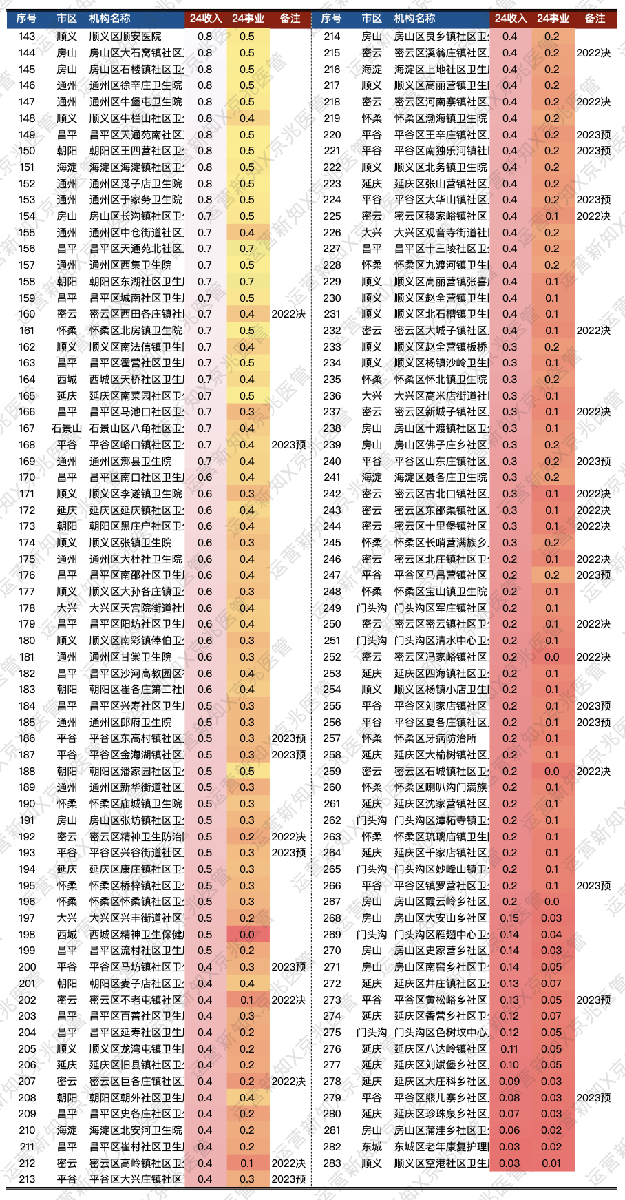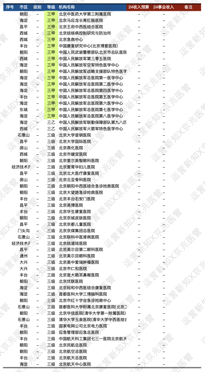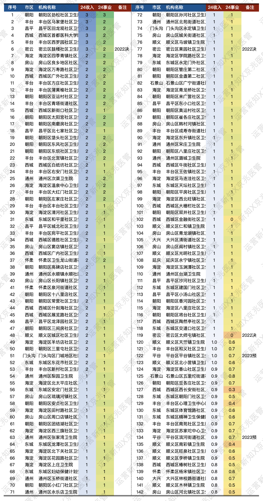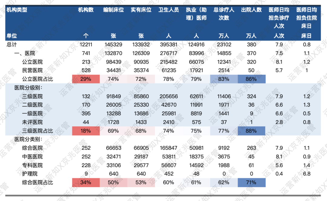 2024年医院运营观察正式开启。 北京作为我国医院医疗技术兜底的存在,各大医院持续多年登顶各大医院排行榜。 笔者在北京生活10年,一些头部医院也实地参观过,实际感受为“能力越大、责任越大”。 北京,简称“京”,是中华人民共和国的首都,是全国的政治中心、文化中心,是世界著名古都和现代化国际城市。 户籍居民期望寿命82.5岁,全国第2 城镇人口比重87.5%,全国第2 卫生总费用3351.9亿元 人均卫生总费用1.4万元(2020),全国第1 居民年均就诊10.4次,全国第2 居民年住院率16.8%,低于全国0.7百分点 医院 每百门急诊入院2.7人次,全国最低 门诊次均680元,住院次均2.6万元,均为全国最高 总住院手术率49%,比全国高9百分点,全国第4 平均住院日8.6天,比全国低0.4天 医疗机构 每百门急诊入院1.7人次,全国最低 人均总收入84万元,全国第2 人均财政拨款13万元,全国第4 人均事业收入64万元,全国第2 人均总支出79万元,全国第2 人均结余4.5万元,全国第3 人员经费支出占比为33.1%,比全国平均低3.6百分点,全国第4低 人均人员经费26.2万元,全国第2 注:数据来自中国卫生健康统计年鉴2022 常住人口2184.3万人,较上年度下降4.3万人 其中外来常住人口占38%,60岁及以上人口占21%,65岁及以上占15% 医疗卫生机构12211家,其中三级医疗机构138家 卫生人员39.5万人,医师12.5万人,管理人员2万人 编制床位14.5万张,其中医院13.3万张,实有床位13.4万张 医疗机构共诊疗23102.4万人次,出院379.5万人次 实有床位使用率65.9%,平均住院日8.1天 全市二级以上公立医院门诊患者次均医药费701.9元,其中药费305.2元 住院患者人均医药费用25372.6元,其中药费5114.0元 全市医疗卫生机构总费用2997.4亿元,比上年增长4.7% 其中财政拨款551.4亿元,比上年增长16.0% 注:数据来自北京卫健委、北京统计年鉴2023 全年实现地区生产总值43760.7亿元,比上年增长5.2% GDP排全国第13 注:以上数据来自北京市统计局。 图 北京国贸 医疗卫生资源状况。“十三五”以来,首都卫生资源总量持续增长,但距国内和国际大城市仍有差距,与人民群众的期盼和首善标准相比还有不足。2020年全市共有医疗卫生机构11211家,实有床位12.7万张,分别较2016年增长5.4%、8.7%。按照机构类别划分,医院733家(公立227家、民营506家),基层医疗卫生机构10183家,专业公共卫生机构111家,其他机构184家。每千常住人口编制和实有床位数分别为6.27张和5.81张,低于全国6.3张的平均水平,也低于上海6.4张、重庆7.4张等国内大城市每千人床位数量,与东京(9.6张)、巴黎(12张)等国际城市差距明显。但核心区每千人实有床位数较高,为13.9张,明显高于外围地区,资源分布不均衡问题仍然凸显。 全市共有三级医院104家(不含驻京部队医院),其中国家卫生健康委属管医院17家、市属医院22家、区属28家、其他部门企业及社会办医37家。全市卫生人员数37.6万人,较2016年增长13.6%。其中执业(助理)医师11.9万人,注册护士13.5万人,每千常住人口执业(助理)医师5.41人、注册护士6.15人。 优质医疗卫生资源主要集中在中心城区,区域分布不均衡。全市三甲医院中超过80%布局在中心城区。大兴、顺义等平原多点地区和密云等生态涵养区优质医疗卫生资源相对不足。 基层卫生服务体系相对薄弱,分级诊疗制度尚未落实到位。分级诊疗在国家层面刚刚起步,尚未充分显现效果。一方面,大医院优质资源聚集促进了学科高度分化发展,医疗水平不断提升,对患者及高水平医学人才“虹吸”作用凸显。部分三甲医院长期处于超负荷运转状态。另一方面,基层医疗卫生机构基础设施相对薄弱、人才队伍和技术能力水平参差不齐,对居民就医吸引力有待提升,尚不能完全满足预防、医疗、康复等卫生保健需求。此外,全国医疗卫生发展水平和资源分布的不均衡,导致外地患者来京就医仍为常态。 学科结构不合理。专科医疗卫生资源配置水平和空间布局有待优化。儿科、肿瘤、精神、康复护理等资源配置相对不足。 举办主体单一,社会办医服务能力不足。优质医疗资源主要集中在公立医院,社会资本举办的医疗机构虽然数量占比不低,但在规模和服务能力上均有待提升。国际医疗服务体系发展尚不健全,与首都国际交往中心功能定位不完全匹配,个性化、国际化医疗服务供给能力亟待提升。 公立医院空间布局和环境亟待改善。本市公立医院基本建设于上世纪五十年代到八十年代,主要集中在中心城区。由于建设年代较早,医疗卫生设施现状与当前医疗技术发展水平和医疗服务需求不相匹配,普遍存在建筑面积不足、空间布局和医疗流程不合理等问题,优质医疗学科发展空间受到很大限制。 ——北京市医疗卫生设施专项规划(2020年-2035年) 注:上下滑动查看。 首都核心区。坚决不能成为“看病中心”,应坚定不移疏解非首都功能,为中央政务国务活动提供安静优良的政务环境。核心区医疗卫生资源主要满足区域内居民健康需要和中央党政军机关运行和政务活动需要。 城市副中心。也不能成为“看病中心”,重点在健全体系、补充功能和资源短板,为副中心及北三县等地区提供高质量综合医疗服务保障。 协同推进央属医院疏解。按照中央确定的疏解项目清单,协同推进部分央属在京三级医院向京外,重点向雄安新区、北三县区域疏解。 增减挂钩,促进区域医疗卫生资源均衡布局。按照增减挂钩的原则,有序推进市属医疗卫生