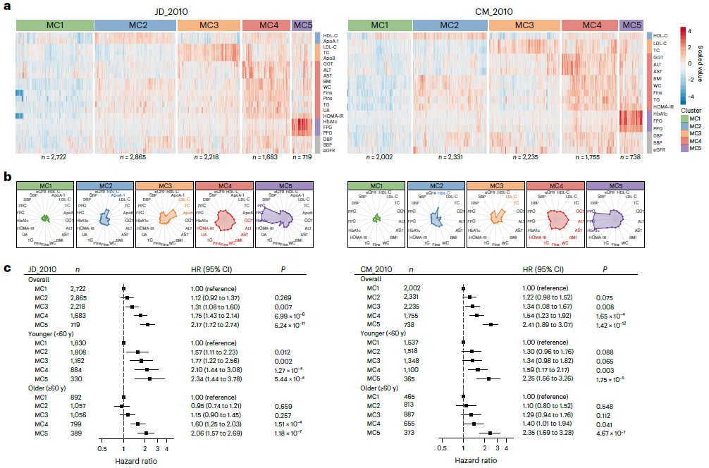 在这项研究中,收集了近2万例40岁以上人群,最长11年的随访数据。综合考虑了包括肥胖、胰岛素敏感性、糖代谢、脂代谢、血压、肝功能、肾功能等在内的21项代谢指标,开创性地构建了5种“代谢共患病亚型簇”,揭示了代谢异常亚型与心血管疾病发生风险的关联。