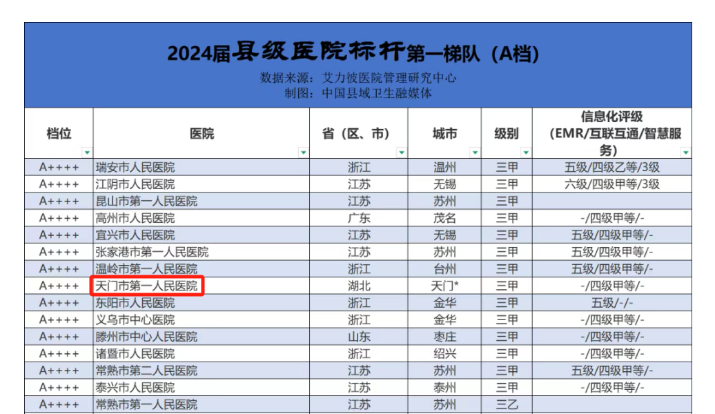 在艾力彼近期发布的全国县(市)级医院标杆排行榜上,天门市第一人民医院(以下简称“天门一医”)凭借卓越的综合实力,一路过关斩将,跃居全国第八,并且创造了中部地区“十四连冠”的战绩。