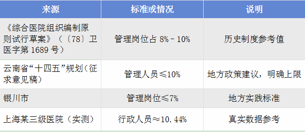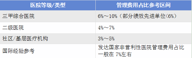 单位管理费占费用总额 管理:“管人,理事”。单位管理费占费用总额,这个指标,很直白就是医院“管人、理事”花的钱占医院全部支出的比例,在卫生财务年报中是一个重要的指标,反映医院“管事成本”的高低,是医院精细化管理非常重要的一个财务指标。 指标计算也非常简单, 单位管理费用占费用总额(%)=管理费用/总费用×100% 管理费用在财务年报中的解释为:反映医院单位本期本级行政及后勤管理部门开展管理活动发生的各项费用,以及由单位统一负担的离退休人员经费、工会经费、诉讼费、中介费等。 管理人员在卫生统计和财务年报中的解释为:医疗卫生机构中担任领导职责或管理任务的工作人员之和,包括从事党政、人事、财务、统计、信息、安全保卫等行政管理工作的人员。 其实,这个指标,比较热门是和现在大家比较关注的医院去行政化、医院压缩行政后勤岗位,向医护等关键岗位倾斜等政策息息相关。如: 1 2024年9月,国家卫健委发布《关于政协第十四届全国委员会第二次会议第04426号(医疗卫生类380号)提案答复的函》,明确表示要配合中央编办积极指导各地在医疗卫生系统事业编制总量内,加强统筹调剂和内部挖潜,优化医院内医务人员结构比例,压缩行政、后勤、辅助等人员,将更多编制资源向儿科岗位等关键和紧缺岗位倾斜。 2 海南省人民政府办公厅发布的《海南省推动公立医院高质量发展实施方案》明确表示要坚持去行政化,推进公立医院去行政化改革,取消公立医院的行政级别;逐步推行院长职业化和聘任制,行政人员不得任院长等领导职务;全面落实公立医院的经营管理自主权,去除编制,实行全员聘用管理。 3 三明医改首创“5:4:1”人员配置原则,即临床50%、医技40%、行政后勤10%。严格控制行政后勤人员比例不得超过全员10%,超编部门需在3个月内通过轮岗、转岗向临床一线分流。河南省安阳市、浙江省台州市等多地也开始效仿。 这个指标,关系着医院的去行政化,向医护人员倾斜等政策,受到了很多的关注。那问题来了,医院一般情况下,到底需要多少行政人员/管理人员?有没有相关文件的规定和约定俗成的比例呀?以下是一些相关的参考: 按道理,医院的管理人员不能不多,但是老兔子去很多医院访谈的时候,听到一些医院管理人员占比达到了20%及以上,吓得人一头冷汗,其实是部分医院把工勤人员也放入管理人员序列,这就造成数字过大。我们在进行统计的时候,一定要明确统计的口径。 对于医院管理者来说,管理费用占比是我们看医院支出和成本的一个重要的指标,虽然国家和行业内没有明确的规定,在很多文献和行业数据可以进行参考。根据国内外相关研究和实践经验,公立医院管理费用占总支出的比例一般在5%至10%之间较为适宜。 管理费用占比不是越低越好,老兔子听到很多临床的老师吐槽,说医院管理人员不创造价值,靠临床养着的,医院管理人员干涉太多,管着管那,不需要设立,这是因为从事工作不同,看待事物的角度完全不同,这能理解。但老兔子一直认为,管理是推动自然效率向管理效率迭代升级的关键步骤,没有管理,任何组织会效率低下,问题迭出。 最近看了一本书,名字很简单粗暴《为什么越“不干活”的人收入越高》,书中对管理人员引入了这么一个公式:管理人员的价值=团队价值×(管理效率-自然效率),我觉得中间观点很对的,医院管理人员的价值体现,我们也要引入这个概念,每花一元的管理费用,能不能带来超过1元的效率提升和运营价值。随着组织从粗放型管理向精细化转变,需要大量高学历、高能力、高素质的管理人才,也需要进入一些管理工具和软件,管理费用不必然的会增加,我们不能看管理人员花了多少,更多的要看花的值不值,也就是管理能创造多少价值。对于管理费用,老兔子个人认为,战略性投入,投资性支出是是必需的,对于无效的报表、低效的会议、重复的人力这些消耗性的支出是非必要的。比如江苏某三甲医院通过各类举措,实现人力资源、财务、后勤集成管理,3年内管理费用占比下降1.7个百分点。具体举措有: 1. 优化管理流程 推行“流程再造”,避免重复审批、人工填报;精简管理层级,实行扁平化管理;应用标准化+信息化系统(如OA、HRP、ERP)。 2.推动信息化替代人力 推行电子病历系统、自助挂号、智能导诊、无纸化办公;建立数据中台,减少人为报表、人工统计。 3. 控制非直接医疗人员比重 设置“非编”人员比例红线;合理外包非核心事务性工作(如简单的文书、档案保管、保洁、食堂、安保等) 4.加强资产使用效率 建立资产管理系统,减少浪费和闲置;控制低效采购和重复建设。 5. 建立绩效考核机制 对管理部门实行“成本-服务双挂钩”考核;管理部门也应“干多干少有别、干好干坏有奖惩”。