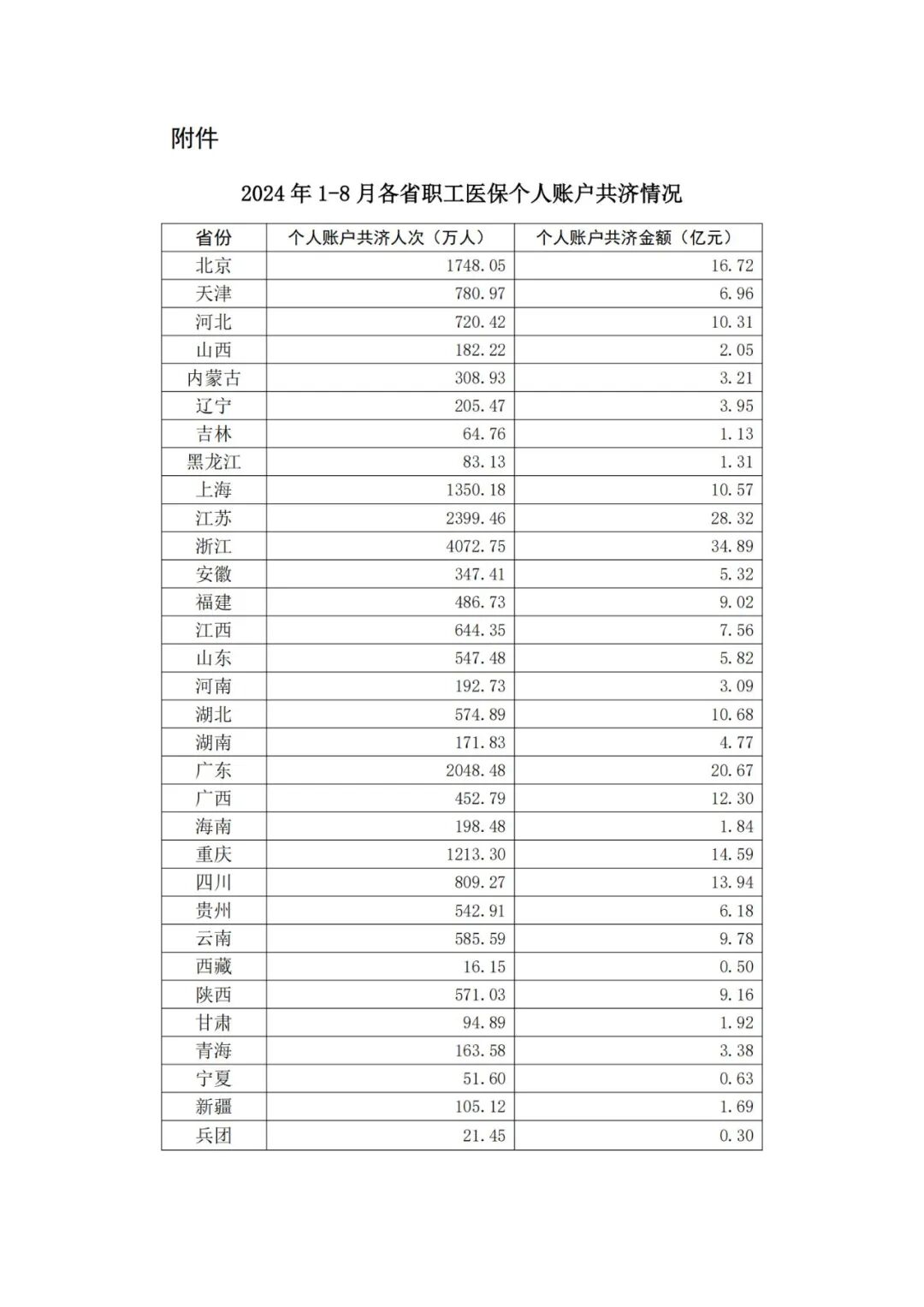 2021年,国办印发文件,将职工医保个人账户使用范围从职工本人,扩大到其参加基本医保的“配偶、父母、子女”,今年1-8月,职工医保个人账户共济金额超260亿元。近日,国办印发文件,进一步将职工医保个人账户共济亲属的范围由“配偶、父母、子女”,扩大至其参加基本医保的“近亲属”,11个省份已将共济范围扩大。 一、11个省份已将共济范围扩大至近亲属 截至9月14日,天津、河北、山西、吉林、山东、河南、湖南、广西、云南、西藏、陕西等11个省份已将职工医保个人账户共济范围由“配偶、父母、子女”扩大至“配偶、父母、子女、兄弟姐妹、祖父母、外祖父母、孙子女、外孙子女”,近一个月时间新增加8个省份。 二、26个省份及新疆生产建设兵团已实现职工医保个人账户省内跨统筹区共济,新增湖北省。 包括北京、天津、河北、山西、内蒙古、吉林、黑龙江、上海、江苏、安徽、福建、江西、山东、湖北、湖南、广西、海南、重庆、四川、贵州、云南、西藏、甘肃、青海、宁夏、新疆共26个省份以及新疆生产建设兵团。只要共济人、被共济人在同一省份内参保,无论是否在同一个城市,都可以实现个人账户资金共济。 另外,河南、陕西两省个人负担的医疗费用,近期已实现职工医保个人账户省内跨统筹区共济。 三、2024年1-8月职工医保个人账户共济2.18亿人次,比1-7月增长0.26亿人次;共济金额262.57亿元,比1-7月增长35.18亿元。 共济人次较多的省份包括浙江、江苏、广东、北京、上海等。共济金额较大的省份包括浙江、江苏、广东、北京、重庆等。 从共济地域看,同一统筹区(通常是同一个地市)内共济2.05亿人次,共济金额239.98亿元;省内跨统筹区共济1280.31万人次,共济金额22.59亿元。 从共济用途看,用于支付在定点医疗机构就医发生的个人负担的医疗费用244.97亿元,用于支付在定点零售药店发生的个人负担的费用10.97亿元,用于参加居民基本医保等的个人缴费4.75亿元(居民医保集中参保缴费期每年9月开始)。 附件:2024年1-8月各省职工医保个人账户共济情况 来源:国家医保局 END (来源:搜药,内容供读者参考学习。如有侵权请联系删除。) — 中睿医药商学院近期热点活动 —