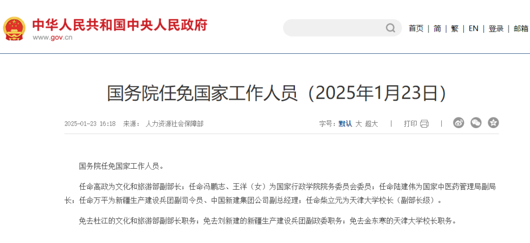 任命高政为文化和旅游部副部长;任命冯鹏志、王洋(女)为国家行政学院院务委员会委员;任命陆建伟为国家中医药管理局副局长;任命万平为新疆生产建设兵团副司令员、中国新建集团公司副总经理;任命柴立元为天津大学校长(副部长级)。