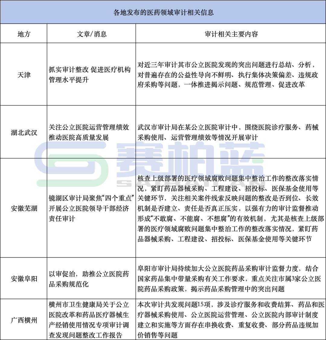 多地审计组密集行动,大批医院被严查。 01 多地审计组行动 医药反腐深入推进 7月19日,中央纪委国家监委网站在《上半年全国纪检监察机关监督检查审查调查数据解读》提出,“打虎拍蝇”无禁区,国有企业、工程建设、能源、消防、高校、医药等权力集中、资金密集、资源富集领域系统整治正在深入推进。 中纪委曾多次发文强调审计在医疗反腐中的作用。如《持续深化纪检监察监督与审计监督贯通协同》一文提到,贵州省纪委监委对审计机关移交的问题线索优先办理、深挖彻查,严肃查处了国企、金融、平台公司、医药、教育等领域一批大案要案。 随着全国医药反腐持续深入,多地审计组已密集展开行动。