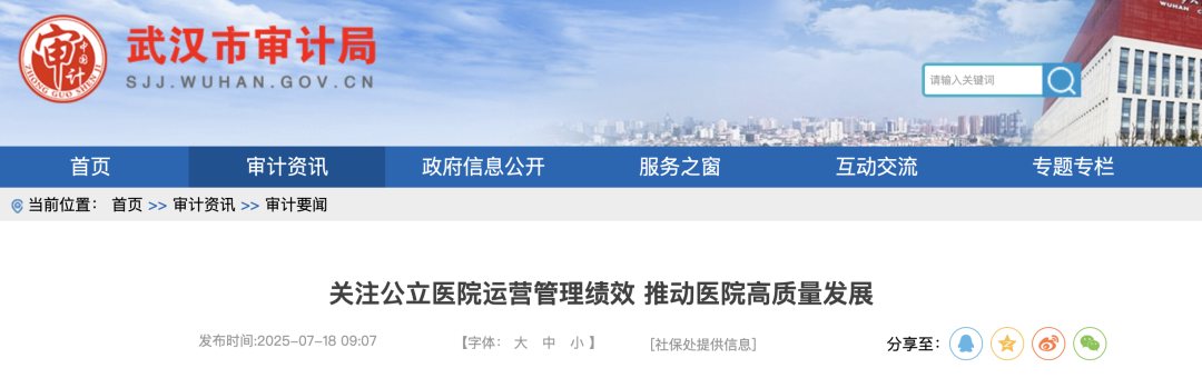 同日,湖北武汉市审计局发布消息称,其针对某公立医院开展审计工作时,围绕医院诊疗服务、药械采购使用、运营管理绩效等方面展开全面审查。重点关注诊疗服务和收费结算、药品医疗器械采购使用以及运营管理绩效等。