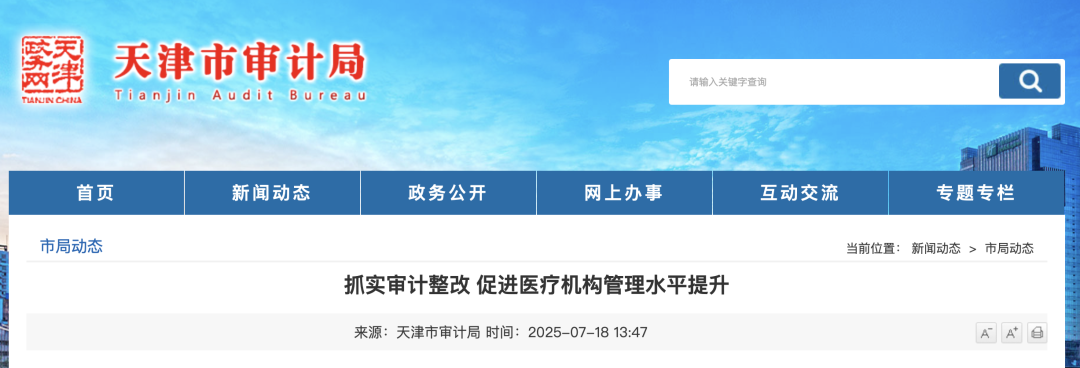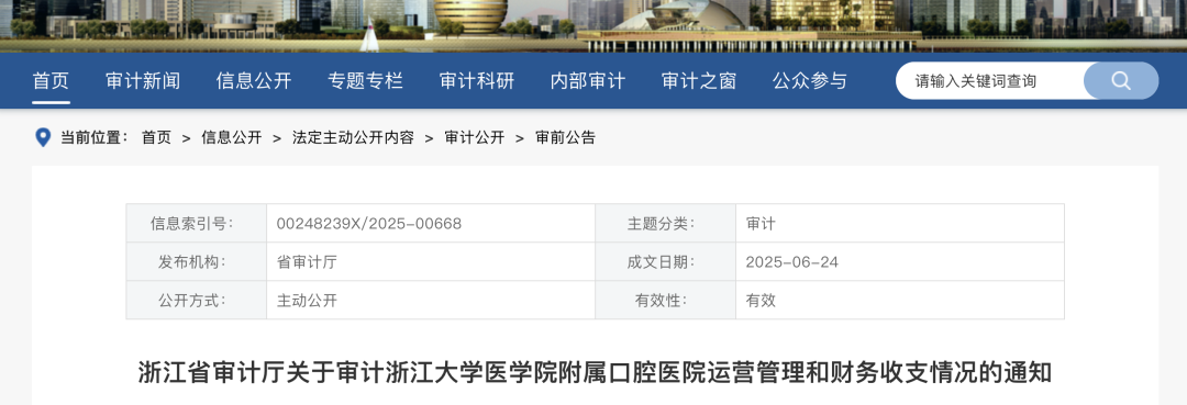 地方层面,多地已启动医疗机构专项审计。如浙江省审计厅发布《关于审计浙江大学医学院附属口腔医院运营管理和财务收支情况的通知》,自6月30日起对浙江大学医学院附属口腔医院2022年至2024年运营管理和财务收支情况进行审计,必要时将追溯到相关年度或者延伸审计有关单位。