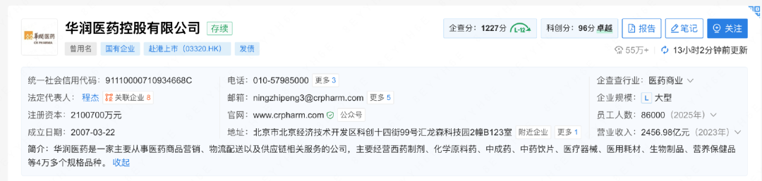 赛柏蓝查询企查查数据发现,华润医药控股有限公司成立于2007年3月,为华润医药集团旗下全资子公司,注册资本达210.07亿元,核心业务涵盖医药商品营销、物流配送以及供应链相关服务等,主要经营西药制剂、化学原料药、中成药、医疗器械等4万多个规格品种。