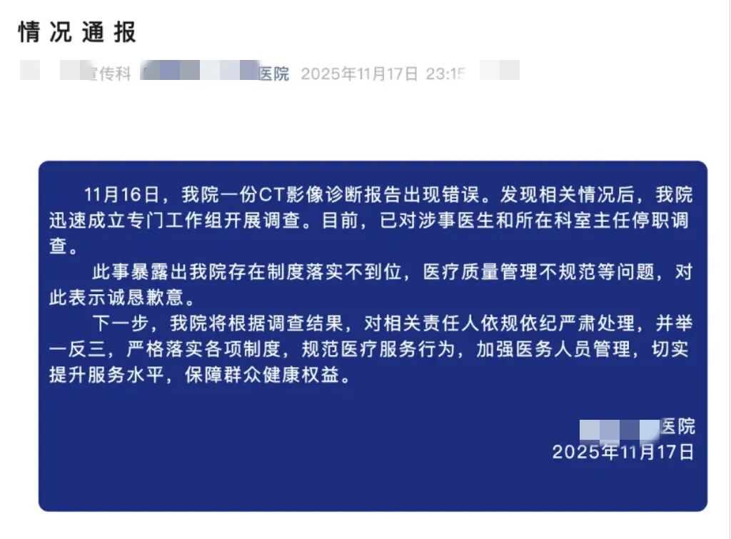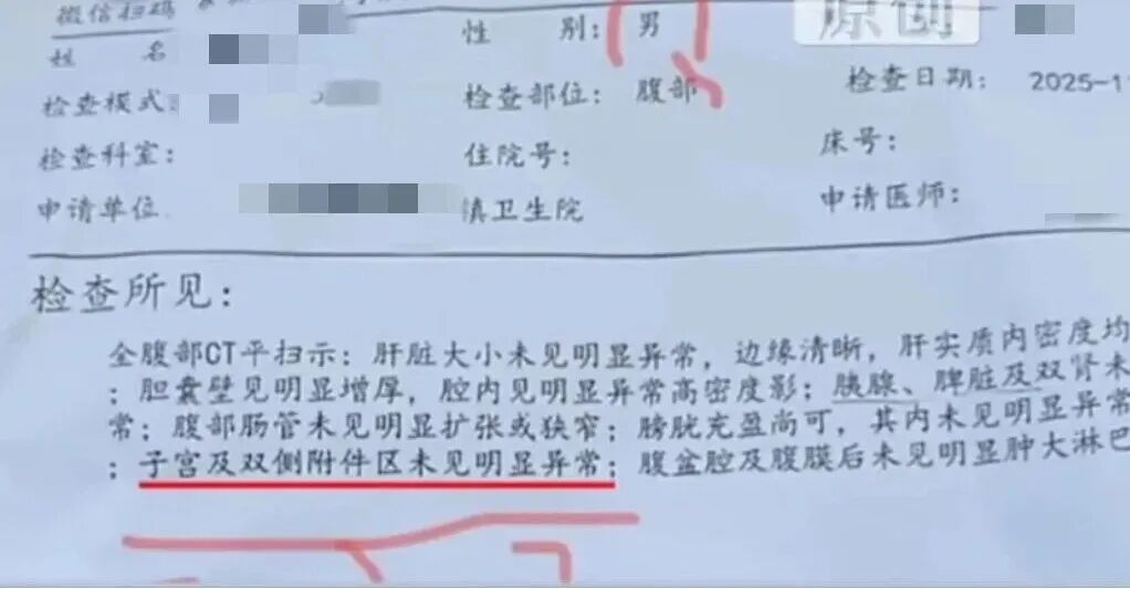 作为医务人员,应在每一次书写中保持严谨,审慎核对,避免模板化失误。 11月16日,一男子发帖称,其腹部CT检查报告单上,竟出现了“子宫及双侧附件区未见异常”的字样,因此质疑作出此报告的三甲医院:“这样的检查报告,太不负责任了。” 根据张先生公开的检查报告,该影像报告单是11月16日上午8点56分,由“某医院放射专家会诊团队”作出的报告,他腹部CT检查中包括“子宫及双侧附件区未见明显异常”。报告医师、审核医师均为李某,审核时间为11月16日9时28分。报告的申请单位为某镇卫生院。 图源:现代快报 11月17日,镇卫生院一名工作人员向记者确认,前述张先生公开的检查报告属实,患者确实在卫生院拍过CT,不过该报告是由某三甲医院出具的。他们的临床医生没注意到报告中错误信息,存在一定的工作失误,后期会加强工作教育,同时自11月17日起,已经中止与该三甲医院的合作。 11月17日下午,三甲医院放射科相关工作人员表示,前述检查单中的报告医师、审核医师李某,确实在该院放射科。该院投诉中心的一名工作人员表示,院方已经成立了调查组,正在调查此事。 11月17日晚,医院正式发布情况通报。 通报内容称11月16日,医院一份CT影像诊断报告出现错误。此事暴露出医院存在制度落实不到位,医疗质量管理不规范等问题,对此表示诚恳歉意。医院已迅速成立专门工作组开展调查。目前,已对涉事医生和所在科室主任停职调查,将根据调查结果,依规依纪严肃处理。 近年来,类似的病历错误引发的社会舆论并不少见。电子病历系统推行后,为提升效率,影像报告常采用结构化模板,这虽能规范书写流程,但也埋下"复制粘贴式错误"的隐患。 值得一提的是,这类错误不能完全归咎于医生的“不负责任”。尽管医务工作者对病历书写的重视程度越来越高,但繁重的工作量,让人难以保证百分之百的书写正确率。 所幸数智时代正在改变这种现状。 上海部分医院正在全国率先探索生成式智慧病历,只要输入现病史就能自动形成病程记录,全新模式大幅缩短了医生的病历书写时间,曾经每份病历起码需要书写十几分钟,而今不到半分钟就能“搞定”,极大提高了病史书写效率。 与此同时,智慧病历避免了人工劳动易出错的环节,使医生专注于治病,显著提升了病历书写的质量和效率。