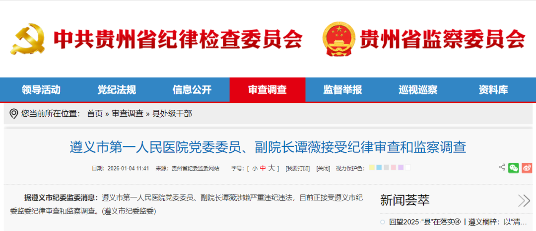2026年1月4日,贵州省纪委监委网站发布消息:遵义市第一人民医院党委委员、副院长谭薇涉嫌严重违纪违法,正接受遵义市纪委监委纪律审查和监察调查。