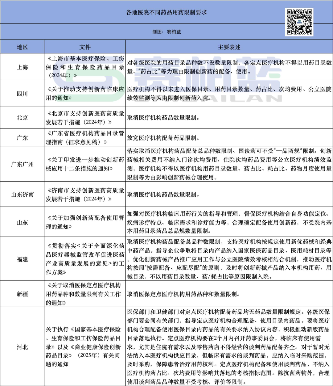 截至目前,北京、上海、山东、福建、新疆、河北 6 地已明确取消医疗机构药品数量限制,广东、四川 2 地进一步放宽配备约束,形成全国范围内的政策联动。其中,河北省的举措尤为具体,不仅明确医保与卫健部门均无药品数量限制要求,还从两大关键环节为政策落地保驾护航: