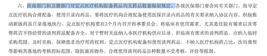 谈判药品不受“一品两规”限制,不得以医保总额限制、医疗机构用药目录数量、药占比为由影响药品进院。