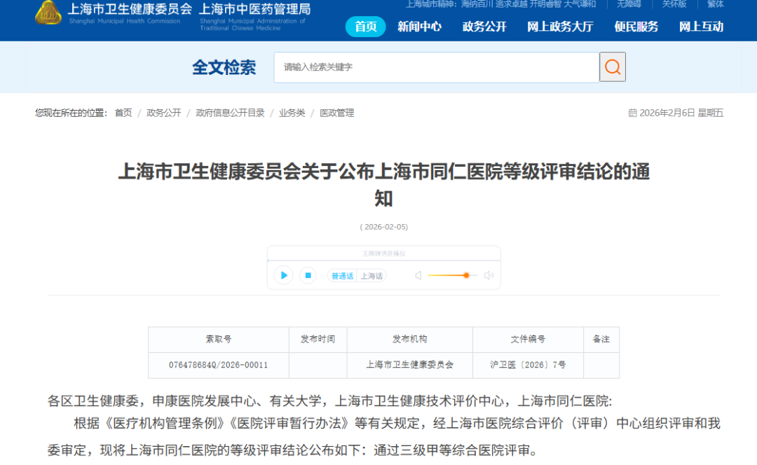 此次通过三甲评审,意味着上海市同仁医院正式迈入三甲医院行列。 2月5日,上海市卫生健康委发布《关于公布上海市同仁医院等级评审结论的通知》。 通知显示,根据《医疗机构管理条例》《医院评审暂行办法》等有关规定,经上海市医院综合评价(评审)中心组织评审和上海市卫生健康委审定,上海市同仁医院通过三级甲等综合医院评审。 公开信息显示,上海市同仁医院,又名上海交通大学医学院附属同仁医院、上海市同仁红十字医院,成立于1866年,是上海开埠以来最早的西医院之一。 2020年7月,上海市同仁医院成功挂牌三级乙等综合医院。此后,该院便将升级“三甲”列为近年来的重点规划。 2024年3月,上海市同仁医院积极对标《上海市三级医院评审标准实施细则(2023年版)》,通过“两个机制”、“两个系统”、“三支队伍”、 “三个协同”加速推进三级甲等综合性医院的创建进程。 2025年8月,上海市长宁区委领导到区卫生健康委开展工作调研,座谈会上提到,要推动上海市同仁医院能级提升,全力推进同仁医院升三甲工作。 官网介绍,十四五规划期间,同仁医院将咬定三级甲等综合性医院目标不放松,走高质量发展的道路,努力建设成为符合双一流大学附属医院水平,具有国际精品城区品质,面向大虹桥、辐射长三角的特色鲜明的现代化综合性医院。 此次通过三甲评审,意味着上海市同仁医院正式迈入三甲医院行列。 来 源 / 中国医院院长