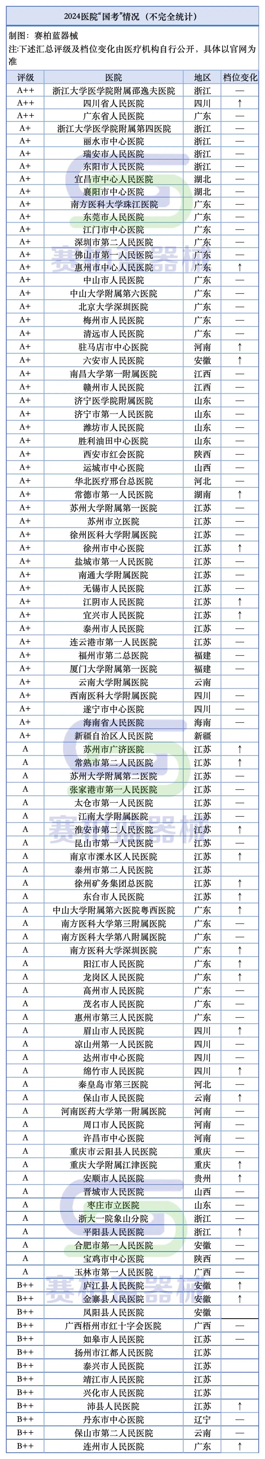 据赛柏蓝器械不完全统计,截至目前已有超百家公立医院公布“国考”成绩,浙江大学医学院附属邵逸夫医院、四川省人民医院、广东省人民医院等医院获评A++。
