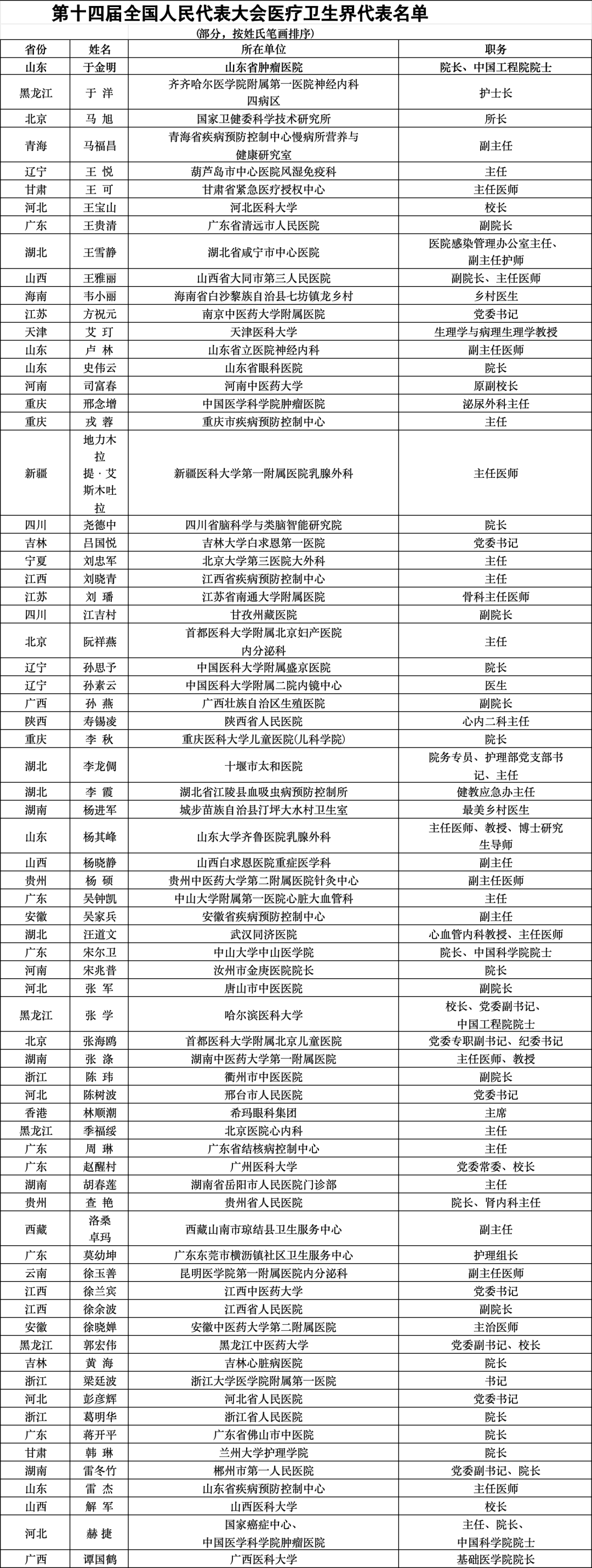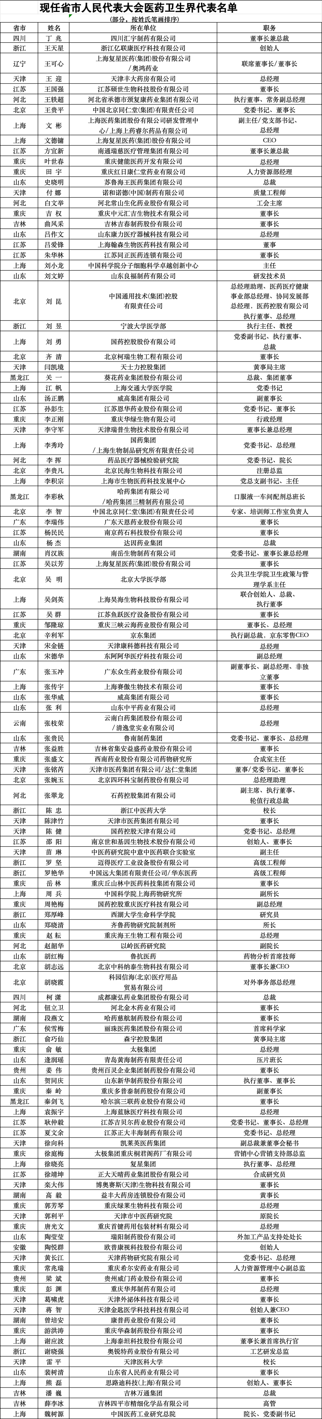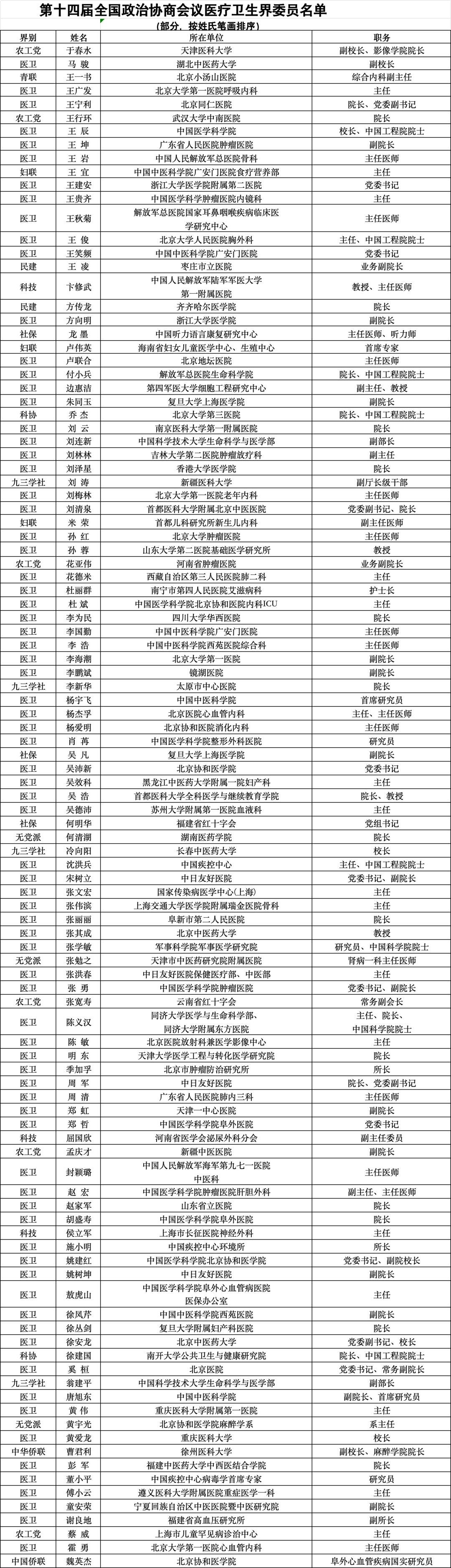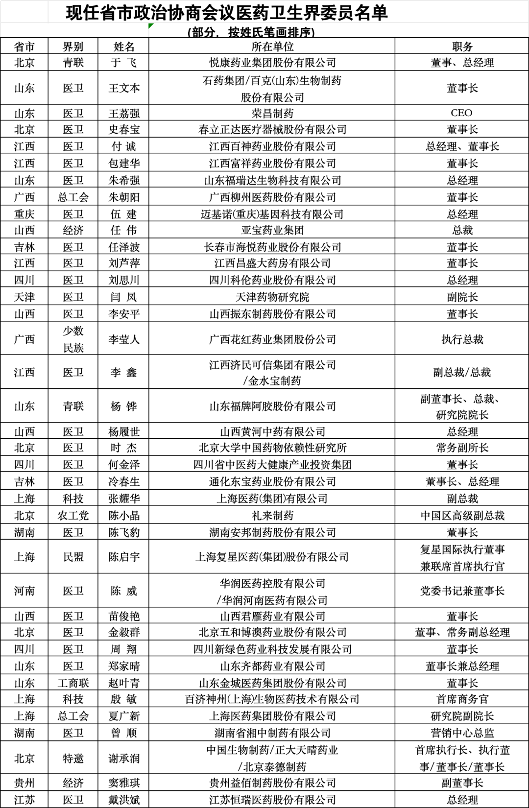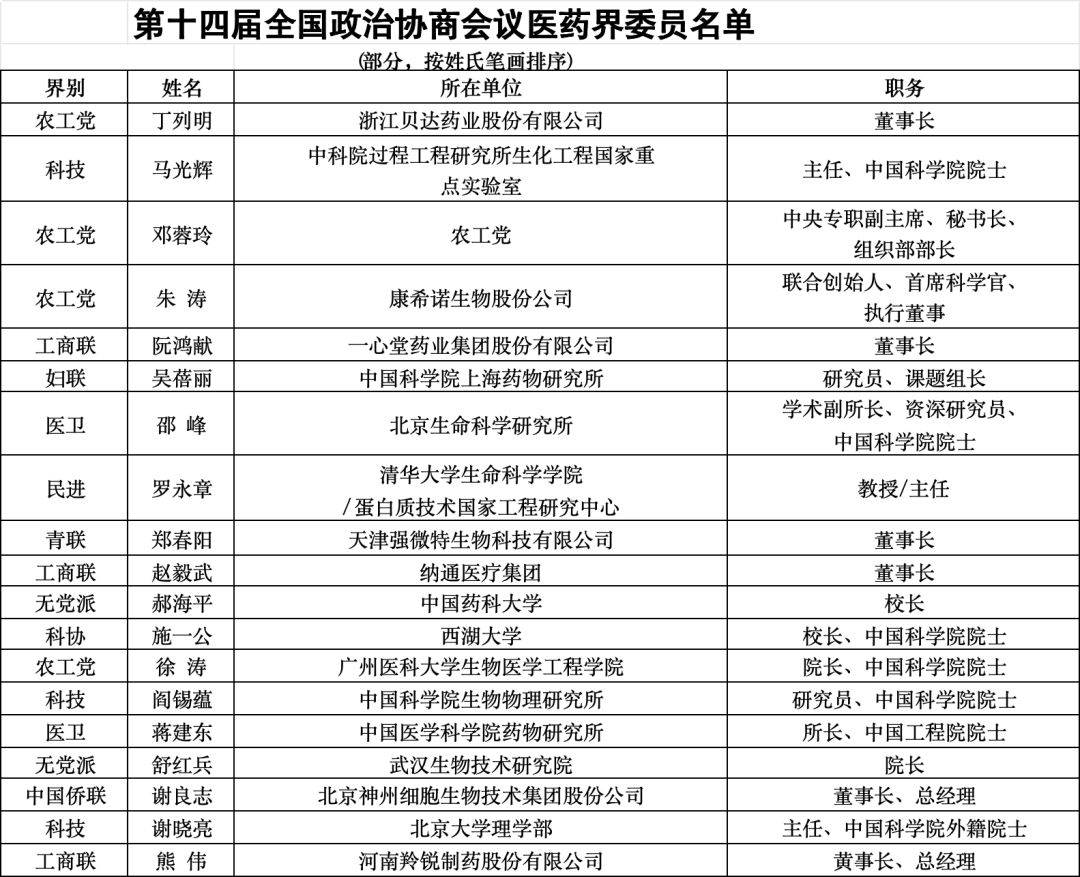 3月4日,2024“声音 · 责任”医药卫生界人大代表政协委员座谈会在北京国宾酒店举行。据《2024医药卫生界人大代表政协委员座谈会资料集》,第十四届全国人民代表大会医药界代表名单、第十四届全国政治协商会议医药界委员名单、第十四届全国人民代表大会医疗卫生界代表名单、第十四届全国政治协商会议医疗卫生界委员名单、现任省市人民代表大会医药卫生界代表名单、现任省市政治协商会议医药卫生界委员名单如下: