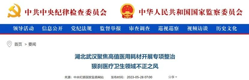 5月28日,中央纪委国家监委网站发布《湖北武汉聚焦高值医用耗材开展专项整治狠刹医疗卫生领域不正之风》一文,高值耗材再次被盯上。