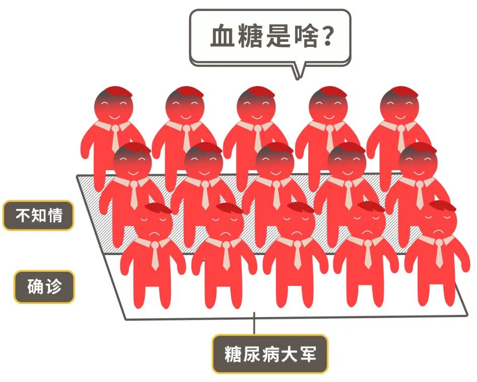 另一项国内的调查数据更可怕,目前我国糖尿病知晓率水平为 36.7%(患糖尿病的人在检测前知道自己得病的人数比率)。也就是说,三分之二的人都不知道自己有糖尿病。