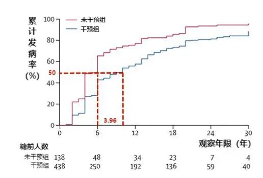 大庆研究发现,生活方式干预 6 年,可使 30 年随访时累计发生 2 型糖尿病的风险下降 39%,2 型糖尿病的发病中位时间推迟 3.96 年。
