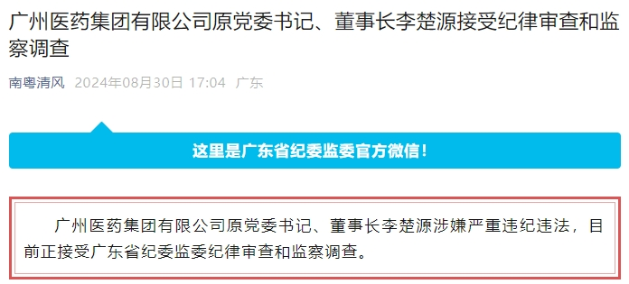 据广东省纪委省监委官方公众号“南粤清风”30日消息,广州医药集团有限公司原党委书记、董事长李楚源涉嫌严重违纪违法,目前正接受广东省纪委监委纪律审查和监察调查。公开资料显示,李楚源,汉族,1965年10月生,广东汕头人,中山大学化学专业本科毕业,1988年7月参加工作,曾先后担任广州白云山制药总厂经营部副部长,白云山股份副总经理、党委书记、董事长,广州白云山中药厂厂长、党委书记,白云山和黄公司总经理、副董事长、党委副书记,广药集团总经理、副董事长、党委副书记,白云山副董事长及医药公司副董事长等职务。自2013年8月8日起,任广药集团党委书记、董事长,及白云山和黄公司副董事长、医药公司非执行董事。此前,7月22日晚间,白云山对外公告,李楚源因个人原因辞去公司第九届董事会董事长、执行董事及董事会战略发展与投资委员会主任职务。辞职后,李楚源不再担任广药集团任何职务。